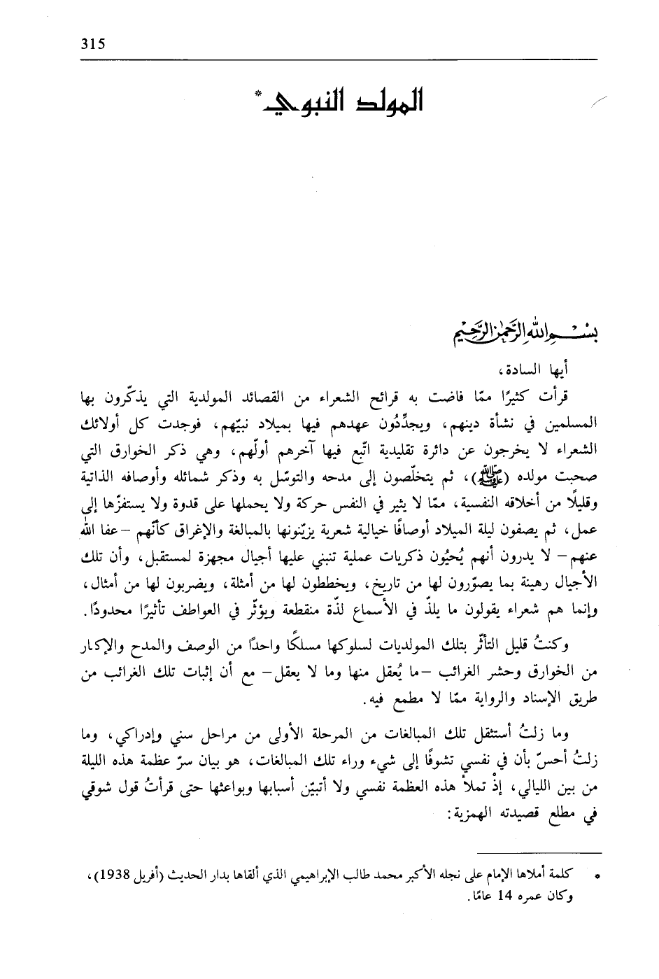 قرأت كثيرًا ممّا فاضت به قرائح الشعراء من القصائد المولدية التي يذكّرون بها المسلمين في نشأة دينهم، ويجدِّدون عهدهم فيها بميلاد نبيّهم، فوجدت كل أولائك الشعراء لا يخرجون عن دائرة تقليدية اتّبع فيها آخرهم أولّهم، وهي ذكر الخوارق التي صحبت مولده - صلى الله عليه وسلم -، ثم يتخلّصون إلى مدحه والتوسّل به وذكر شمائله وأوصافه الذاتية وقليلًا من أخلاقه النفسية، ممّا لا يثير في النفس حركة ولا يحملها على قدوة ولا يستفزّها إلى عمل، ثم يصفون ليلة الميلاد أوصافًا خيالية شعرية يزيّنونها بالمبالغة والإغراق كانهم- عفا الله عنهم- لا يدرون أنهم يُحيُون ذكريات عملية تنبني عليها أجيال مجهزة لمستقبل، وأن تلك الأجيال رهينة بما يصوّرون لها من تاريخ، ويخططون لها من أمثلة، ويضربون لها من أمثال، وإنما هم شعراء يقولون ما يلذّ في الأسماع لذّة منقطعة ويؤثّر في العواطف تأثيرًا محدودًا.
