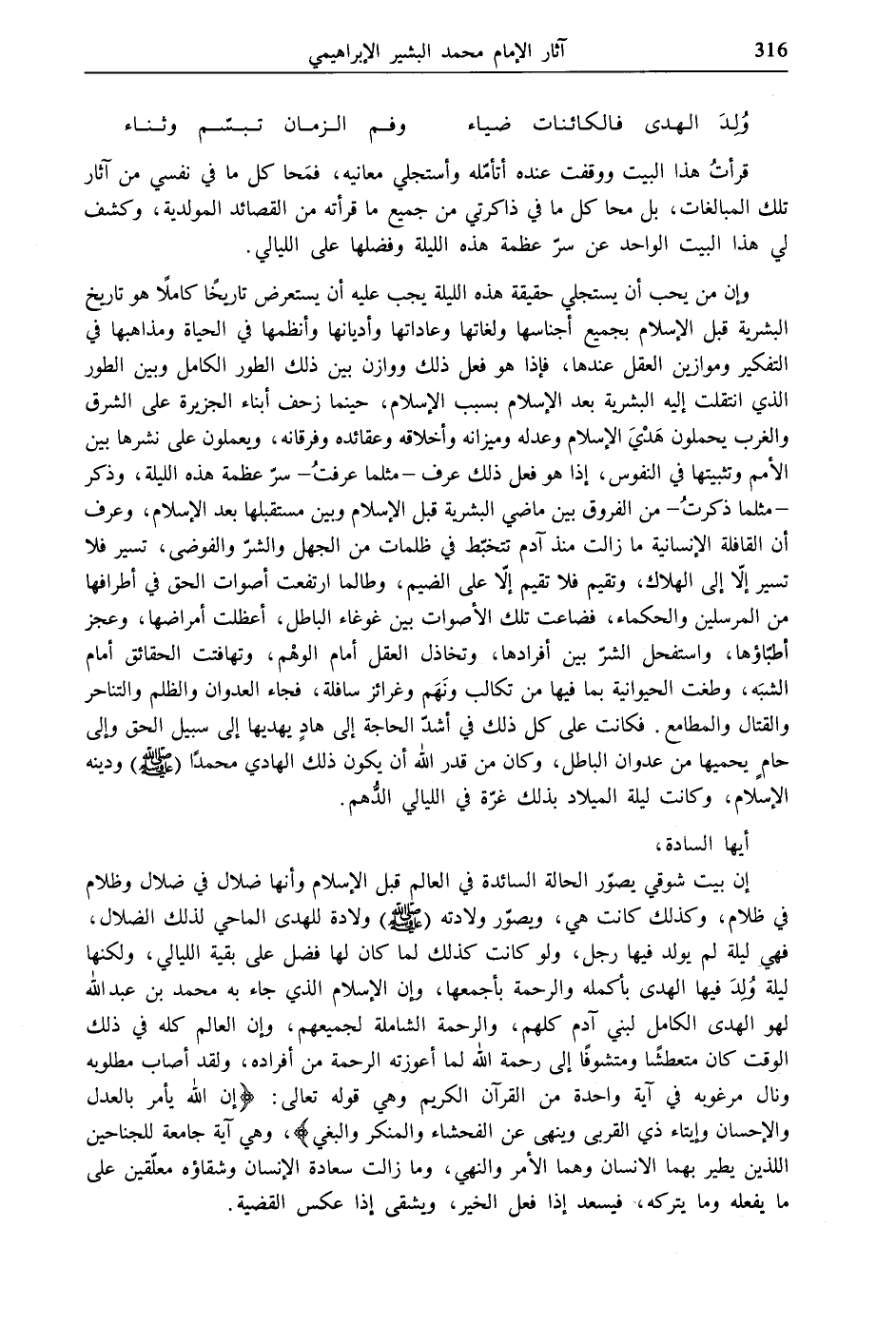 وإن من يحب أن يستجلي حقيقة هذه الليلة يجب عليه أن يستعرض تاريخًا كاملًا هو تاريخ البشرية قبل الإسلام بجميع أجناسها ولغاتها وعاداتها وأديانها وأنظمها في الحياة ومذاهبها في التفكير وموازين العقل عندها، فإذا هو فعل ذلك ووازن بين ذلك الطور الكامل وبين الطور الذي انتقلت إليه البشرية بعد الإسلام بسبب الإسلام، حينما زحف أبناء الجزيرة على الشرق والغرب يحملون هَدْيَ الإسلام وعدله وميزانه وأخلاقه وعقائده وفرقانه، ويعملون على نشرها بين الأمم وتثبيتها في النفوس، إذا هو فعل ذلك عرف- مثلما عرفتُ- سرّ عظمة هذه الليلة، وذكر - مثلما ذكرتُ- من الفروق بين ماضي البشرية قبل الإسلام وبين مستقبلها بعد الإسلام، وعرف أن القافلة الإنسانية ما زالت منذ آدم تتخبّط في ظلمات من الجهل والشرّ والفوضى، تسير فلا تسير إلّا إلى الهلاك، وتقيم فلا تقيم إلّا على الضيم، وطالما ارتفعت أصوات الحق في أطرافها من المرسلين والحكماء، فضاعت تلك الأصوات بين غوغاء الباطل، أعظلت أمراضها، وعجز أطبّاؤها، واستفحل الشرّ بين أفرادها، وتخاذل العقل أمام الوهْم، وتهافتت الحقائق أمام الشبَه، وطغت الحيوانية بما فيها من تكالب ونَهَم وغرائز سافلة، فجاء العدوان والظلم والتناحر والقتال والمطامع. فكانت على كل ذلك في أشدّ الحاجة إلى هادٍ يهديها إلى سبيل الحق وإلى حام يحميها من عدوان الباطل، وكان من قدر الله أن يكون ذلك الهادي محمدًا - صلى الله عليه وسلم - ودينه الإسلام، وكانت ليلة الميلاد بذلك غرّة في الليالي الدُّهم.