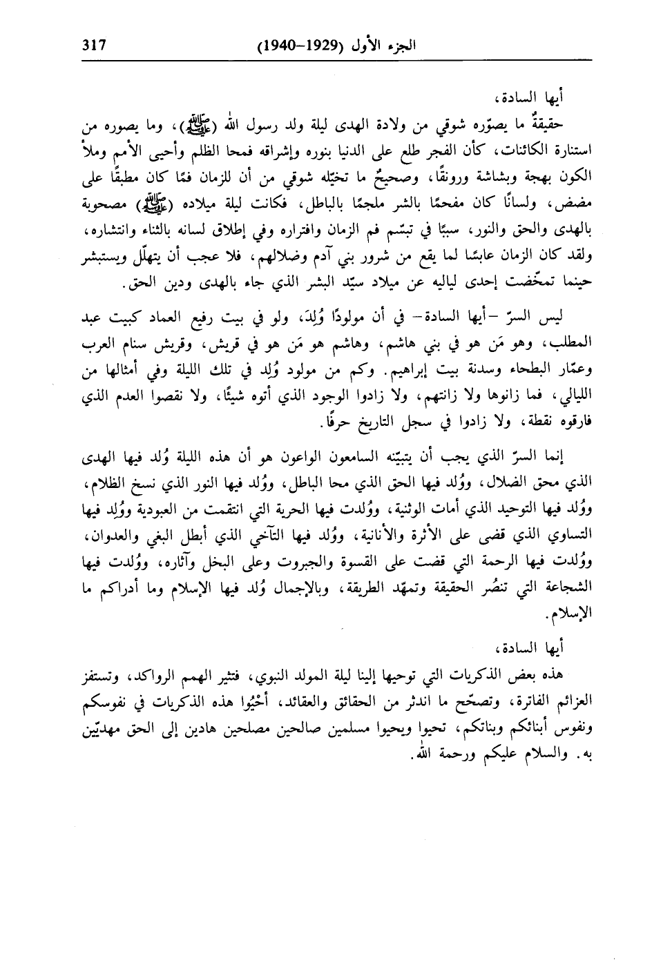 إنما السرّ الذي يجب أن يتبيّنه السامعون الواعون هو أن هذه الليلة وُلد فيها الهدى الذي محق الضلال، ووُلد فيها الحق الذي محا الباطل، ووُلد فيها النور الذي نسخ الظلام، ووُلد فيها التوحيد الذي أمات الوثنية، ووُلدت فيها الحرية التي انتقمت من العبودية ووُلد فيها التساوي الذي قضى على الأثرة والأنانية، ووُلد فيها التآخي الذي أبطل البغي والعدوان، ووُلدت فيها الرحمة التي قضت على القسوة والجبروت وعلى البخل وآثاره، ووُلدت فيها الشجاعة التي تنصُر الحقيقة وتمهّد الطريقة، وبالإجمال وُلد فيها الإسلام وما أدراكم ما الإسلام.