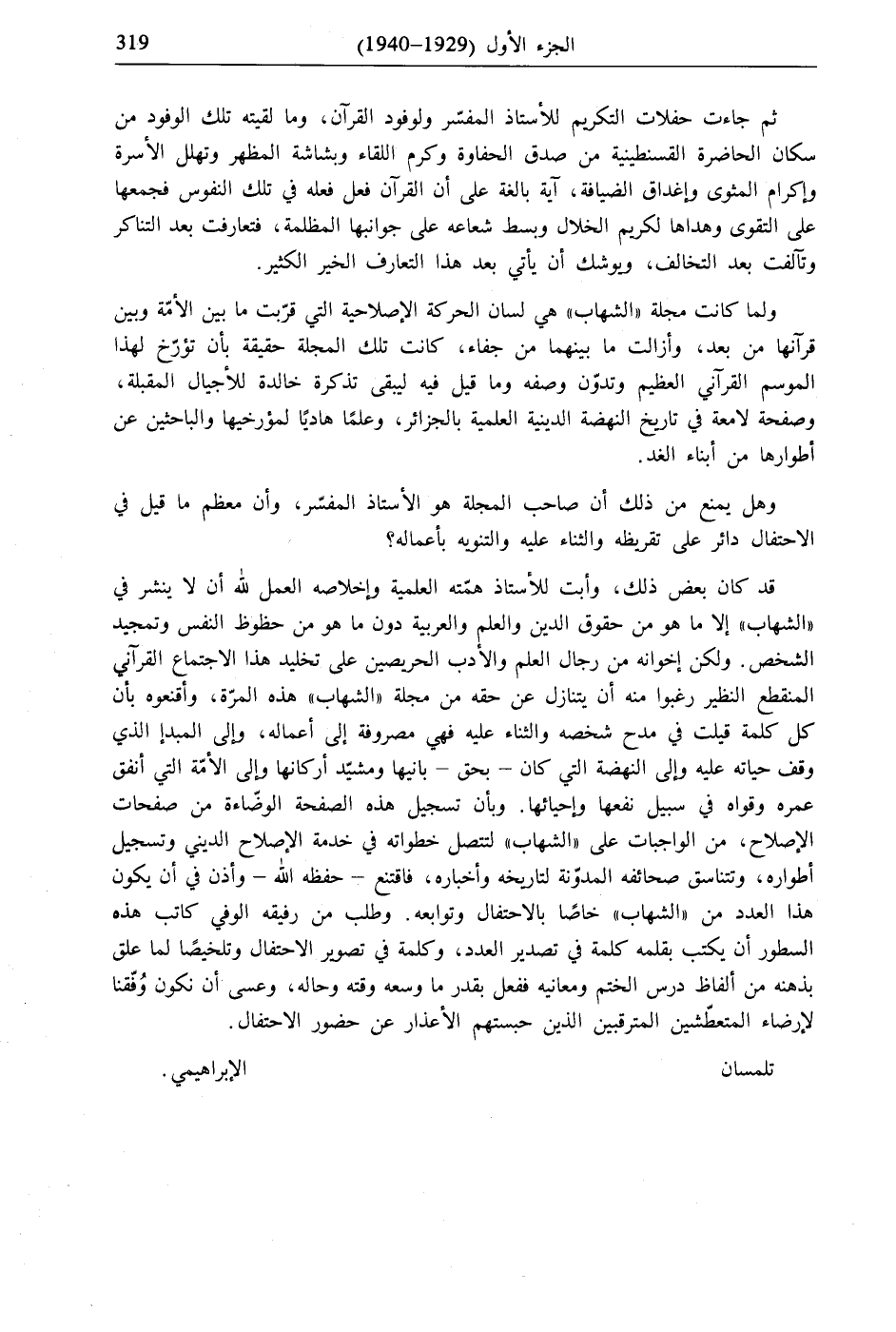 قد كان بعض ذلك، وأبت للأستاذ همّته العلمية وإخلاصه العمل لله أن لا ينشر في "الشهاب" إلا ما هو من حقوق الدين والعلم والعربية دون ما هو من حظوظ النفس وتمجيد الشخص. ولكن إخوانه من رجال العلم والأدب الحريصين على تخليد هذا الاجتماع القرآني المنقطع النظير رغبوا منه أن يتنازل عن حقه من مجلة "الشهاب" هذه المرّة، وأقنعوه بأن كل كلمة قيلت في مدح شخصه والثناء عليه فهي مصروفة إلى أعماله، وإلى مبدإ الذي وقف حياته عليه وإلى النهضة التي كان- بحق- بانيها ومشيّد أركانها وإلى الأمّة التي أنفق عمره وقواه في سبيل نفعها وإحيائها. وبأن تسجيل هذه الصفحة الوضّاءة من صفحات الإصلاح، من الواجبات على "الشهاب" لتتصل خطواته في خدمة الإصلاح الديني وتسجيل أطواره، وتتناسق صحائفه المدونة لتاريخه وأخباره، فاقتنع- حفظه الله- وأذن في أن يكون هذا العدد من "الشهاب" خاصًا بالاحتفال وتوابعه. وطلب من رفيقه الوفي كاتب هذه السطور أن يكتب بقلمه كلمة في تصدير العدد، وكلمة في تصوير الاحتفال وتلخيصًا لما علق بذهنه من ألفاظ درس الختم ومعانيه ففعل بقدر ما وسعه وقته وحاله، وعسى أن نكون وُفّقنا لإرضاء المتعطّشين المترقبين الذين حبستهم الأعذار عن حضور الاحتفال.