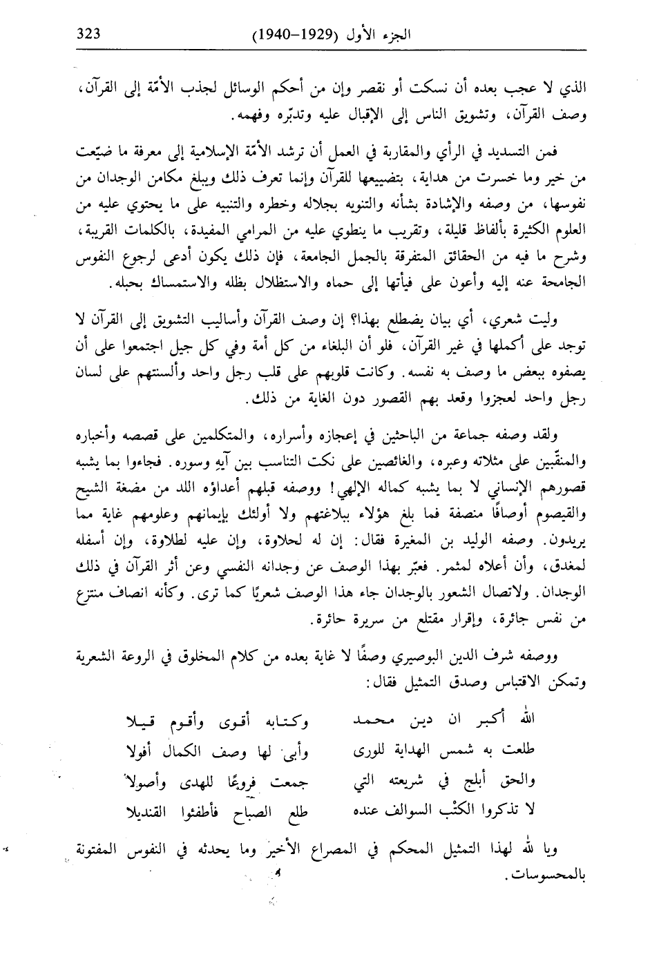 وليت شعري، أي بيان يضطلع بهذا؟ إن وصف القرآن وأساليب التشويق إلى القرآن لا توجد على أكملها في غير القرآن، فلو أن البلغاء من كل أمة وفي كل جيل اجتمعوا على أن يصفوه ببعض ما وصف به نفسه. وكانت قلولهم على قلب رجل واحد وألسنتهم على لسان رجل واحد لعجزوا وقعد بهم القصور دون الغاية من ذلك.