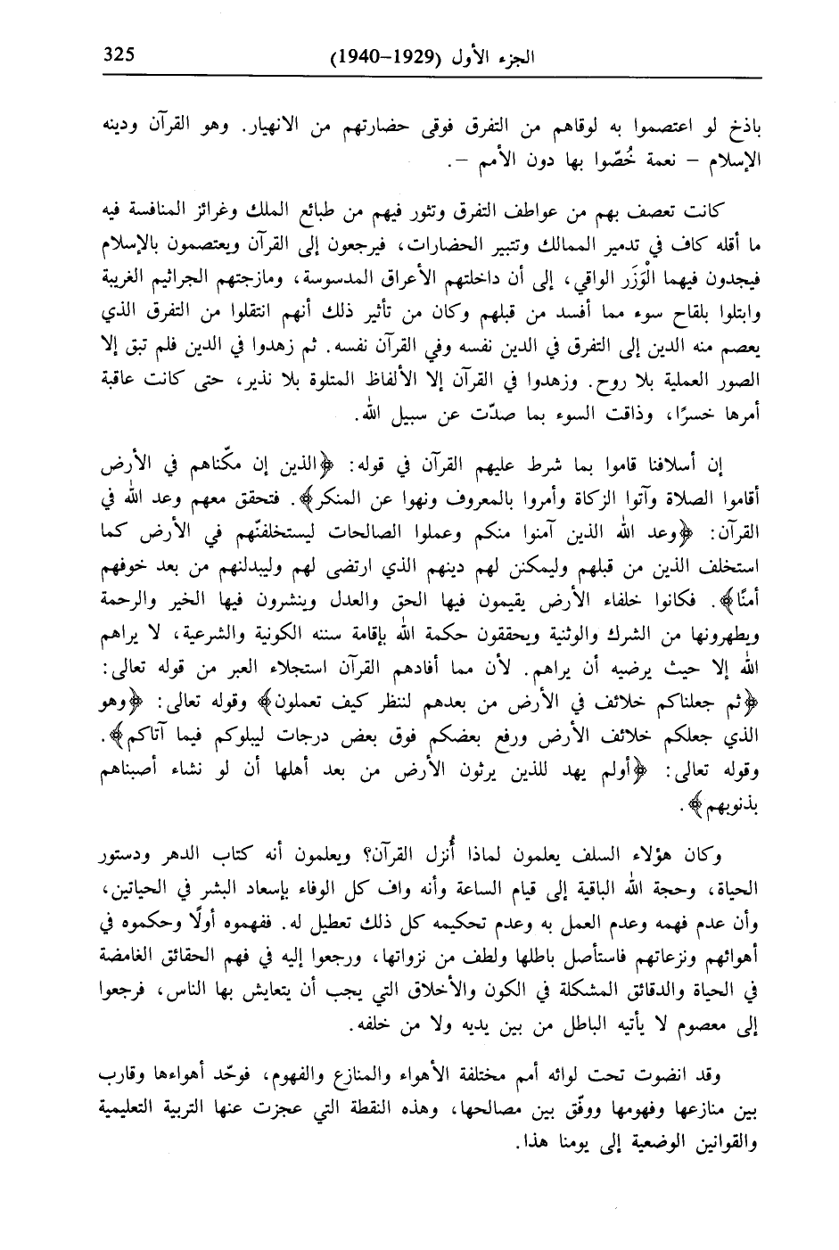 إن أسلافنا قاموا بما شرط عليهم القرآن في قوله: {الَّذِينَ إِنْ مَكَّنَّاهُمْ فِي الْأَرْضِ أَقَامُوا الصَّلَاةَ وَآتَوُا الزَّكَاةَ وَأَمَرُوا بِالْمَعْرُوفِ وَنَهَوْا عَنِ الْمُنْكَرِ}. فتحقق معهم وعد الله في القرآن: {وَعَدَ اللَّهُ الَّذِينَ آمَنُوا مِنْكُمْ وَعَمِلُوا الصَّالِحَاتِ لَيَسْتَخْلِفَنَّهُمْ فِي الْأَرْضِ كَمَا اسْتَخْلَفَ الَّذِينَ مِنْ قَبْلِهِمْ وَلَيُمَكِّنَنَّ لَهُمْ دِينَهُمُ الَّذِي ارْتَضَى لَهُمْ وَلَيُبَدِّلَنَّهُمْ مِنْ بَعْدِ خَوْفِهِمْ أَمْنًا}. فكانوا خلفاء الأرض يقيمون فيها الحق والعدل وينشرون فيها الخير والرحمة ويطهرونها من الشرك والوثنية ويحققون حكمة الله بإقامة سننه الكونية والشرعية، لا يراهم الله إلا حيث يرضيه أن يراهم. لأن مما أفادهم القرآن استجلاء العبر من قوله تعالى: {ثُمَّ جَعَلْنَاكُمْ خَلَائِفَ فِي الْأَرْضِ مِنْ بَعْدِهِمْ لِنَنْظُرَ كَيْفَ تَعْمَلُونَ} وقوله تعالى: {وَهُوَ الَّذِي جَعَلَكُمْ خَلَائِفَ الْأَرْضِ وَرَفَعَ بَعْضَكُمْ فَوْقَ بَعْضٍ دَرَجَاتٍ لِيَبْلُوَكُمْ فِي مَا آتَاكُمْ}. وقوله تعالى: {أَوَلَمْ يَهْدِ لِلَّذِينَ يَرِثُونَ الْأَرْضَ مِنْ بَعْدِ أَهْلِهَا أَنْ لَوْ نَشَاءُ أَصَبْنَاهُمْ بِذُنُوبِهِمْ}.