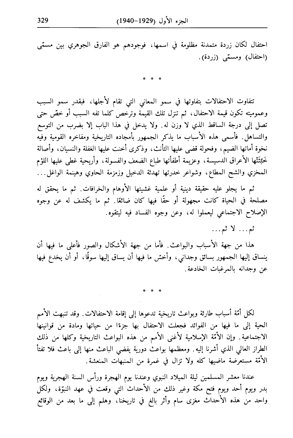لكل أمّة أسباب طارئة وبواعث تاريخية تدعوها إلى إقامة الاحتفالات. وقد تنبهت الأمم الحية إلى ما فيها من الفوائد فجعلت الاحتفال بها جزءًا من حياتها ومادة من قوانينها الاجتماعية. وإن الأمّة الإسلامية لأغنى الأمم من هذه البواعث التاريخية وكلها من ذلك الطراز العالي الذي أشرنا إليه. ومعظمها بواعث دورية يفضي الباعث منها إلى باعث فلا تفتأ الأمّة مستعرضة ماضيها كله ولا تزال في غمرة من المنبهات المنعشة.