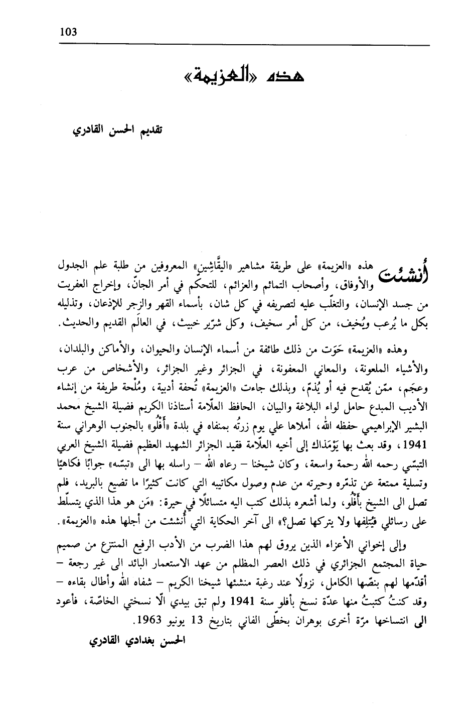 وإلى إخواني الأعزاء الذين يروق لهم هذا الضرب من الأدب الرفيع المنتزع من صميم حياة المجتمع الجزائري في ذلك العصر المظلم من عهد الاستعمار البائد إلى غير رجعة- أقدّمها لهم بنصّها الكامل، نزولاً عند رغبة منشئها شيخنا الكريم- شفاه الله وأطال بقاءه- وقد كنتُ كتبتُ منها عدّة نسخ بأفلو سنة 1941 ولم تبق بيدي إلّا نسختي الخاصّة، فأعود إلى انتساخها مرّة أخرى بوهران بخطّى الفاني بتاريخ 13 يونيو 1963.
