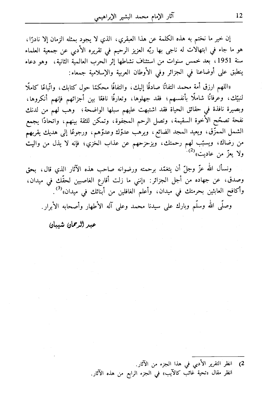 إن خير ما نختم به هذه الكلمة عن هذا العبقري، الذي لا يجود بمثله الزمان إلا نادرًا، هو ما جاء في ابتهالات له ناجى بها ربّه العزيز الرحيم في تقريره الأدبي عن جمعية العلماء سنة 1951، بعد خمس سنوات من استئناف نشاطها إثر الحرب العالمية الثانية، وهو دعاء ينطبق على أوضاعنا في الجزائر وفي الأوطان العربية والإسلامية جمعاء:
