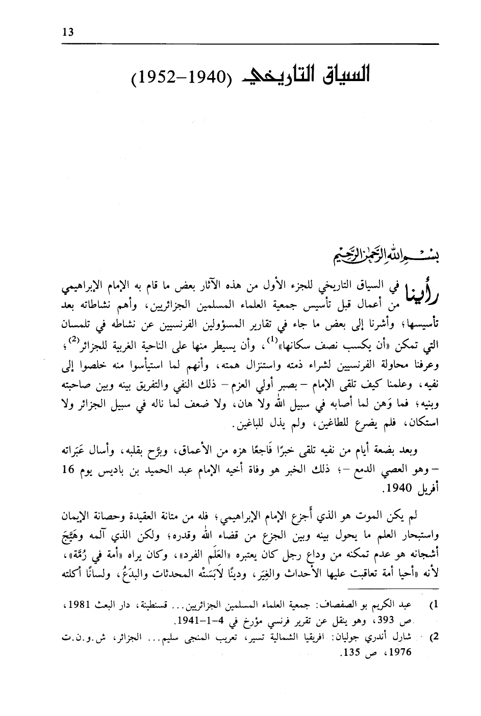 رأينا في السياق التاريخي للجزء الأول من هذه الآثار بعض ما قام به الإمام الإبراهيمي من أعمال قبل تأسيس جمعية العلماء المسلمين الجزائريين، وأهم نشاطاته بعد تأسيسها، وأشرنا إلى بعض ما جاء في تقارير المسؤولين الفرنسيين عن نشاطه في تلمسان التي تمكن "أن يكسب نصف سكانها" (1)، وأن يسيطر منها على الناحية الغربية للجزائر (2)، وعرفنا محاولة الفرنسيين لشراء ذمته واستنزال همته، وأنهم لما استيأسوا منه خلصوا إلى نفيه، وعلمنا كيف تلقى الإمام- بصبر أولي العزم- ذلك النفي والتفريق بينه وبين صاحبته وبنيه، فما وَهن لما أصابه في سبيل الله ولا هان، ولا ضعف لما ناله في سبيل الجزائر ولا استكان، فلم يضرع للطاغين، ولم يذل للباغين.