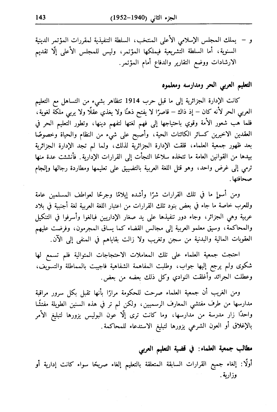 ومن الغريب أن جمعية العلماء صرحت للحكومة مرارًا بأنها تقبل بكل سرور مراقبة مدارسها من طرف مفتشي المعارف الرسميين، ولكن لم تر في هذه السنين الطويلة مفتشًا واحدًا زار مدرسة من مدارسها، وما كانت ترى إلّا عون البوليس يزورها لتبليغ الأمر بالإغلاق أو العون الشرعي يزورها لتبليغ الاستدعاء للمحاكمة.