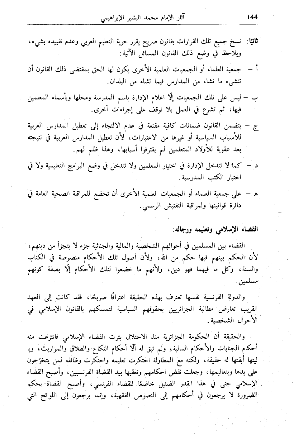 والحقيقة أن الحكومة الجزائرية منذ الاحتلال بترت القضاء الإسلامي فانتزعت منه أحكام الجنايات والأحكام المالية، ولم تبق له إلّا أحكام النكاح والطلاق والمواريث، ويا ليتها أبقتها له حقيقة، ولكنه مع المطاولة احتكرت تعليمه واحتكرت وظائفه لمن يتخرّجون على يدها وبتعاليمها، وجعلت نقض أحكامهم وتعقبها بيد القضاة الفرنسيين، وأصبح القضاء الإسلامي حتى في هذا القدر الضئيل خاضعًا للقضاء الفرنسي، وأصبح القضاة بحكم الضرورة لا يرجعون في أحكامهم إلى النصوص الفقهية، وإنما يرجعون إلى اللوائح التي