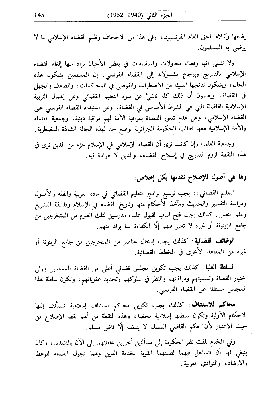 ولا ننسى أنها وقعت محاولات واستفتاءات في بعض الأحيان يراد منها إلغاء القضاء الإسلامي بالتدريج وإرجاع شمولاته إلى القضاء الفرنسي. إن المسلمين يشكون هذه الحال، ويشكون نتائجها السيئة من الاضطراب والفوضى في المحاكمات، والضعف والجهل في القضاة، ويعلمون أن ذلك كله ناشئ عن سوء التعليم القضائي وعن إهمال التربية الإسلامية الفاضلة التي هي الشرط الأساسي في القضاة، وعن استبداد القضاء الفرنسي على القضاء الإسلامي، وعن عدم شعور القضاة بمراقبة الأمة لهم مراقبة دينية، وجمعية العلماء والأمة الإسلامية معها تطالب الحكومة الجزائرية بوضع حد لهذه الحالة الشاذة المضطربة.