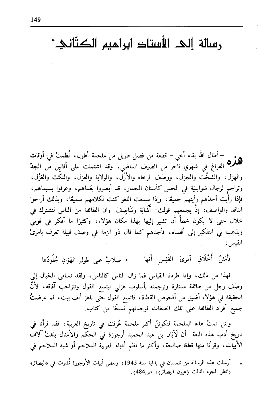 * أرسلت هذه الرسالة من تلمسان في بداية سنة 1945، وبعض أبيات الأرجوزة نُشرت في "البصائر" (أنظر الجزء الثالث (عيون البصائر، [ص:484]).