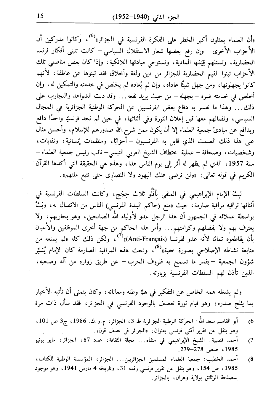 6) أبو القاسم سعد الله: الحركة الوطنية الجزائرية ط 3، الجزائر، م. و. ك. 1986، ج 3 ص 151، وهو ينقل عن تقرير أمْني فرنسي بعنوان: "الجزائر في نصف قرن".