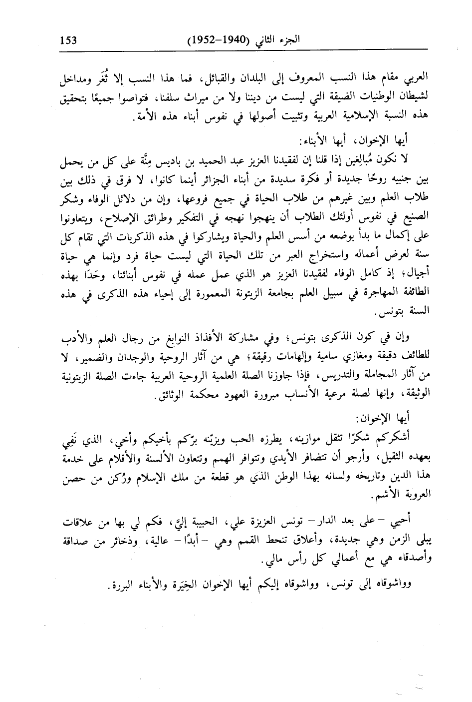 لا نكون مُبالِغين إذا قلنا إن لفقيدنا العزيز عبد الحميد بن باديس مِنَّة على كل من يحمل بين جنبيه روحًا جديدة أو فكرة سديدة من أبناء الجزائر أينما كانوا، لا فرق في ذلك بين طلاب العلم وبين غيرهم من طلاب الحياة في جميع فروعها، وإن من دلائل الوفاء وشكر الصنيع في نفوس أولئك الطلاب أن ينهجوا نهجه في التفكير وطرائق الإصلاح، ويتعاونوا على إكمال ما بدأ بوضعه من أسس العلم والحياة ويشاركوا في هذه الذكريات التي تقام كل سنة لعرض أعماله واستخراج العبر من تلك الحياة التي ليست حياة فرد وإنما هي حياة أجيال؛ إذ كامل الوفاء لفقيدنا العزيز هو الذي عمل عمله في نفوس أبنائنا، وحَدَا بهذه الطائفة المهاجرة في سبيل العلم بجامعة الزيتونة المعمورة إلى إحياء هذه الذكرى في هذه السنة بتونس.
