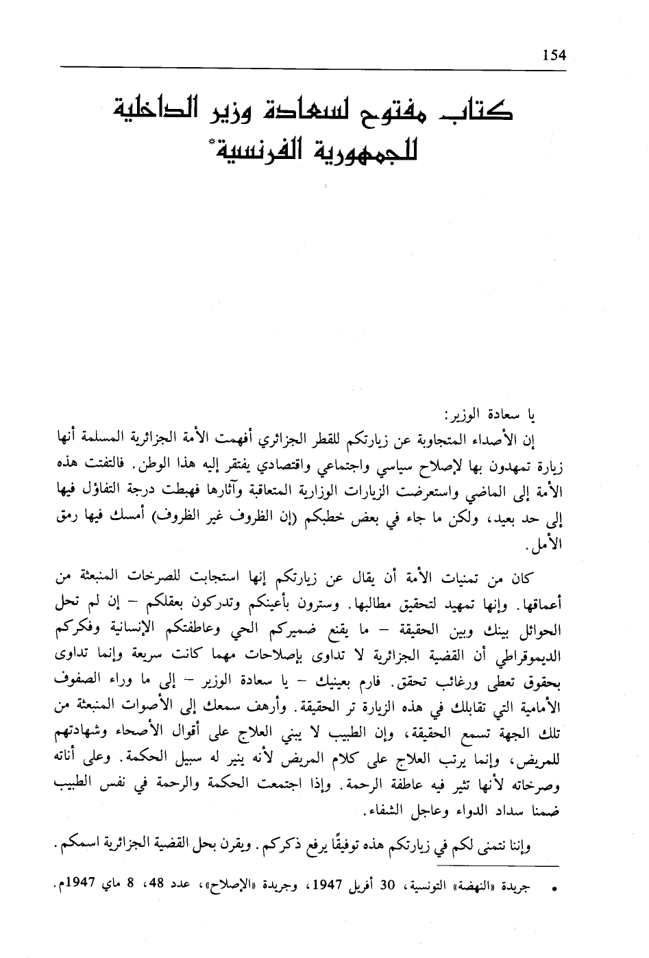 كان من تمنيات الأمة أن يقال عن زيارتكم إنها استجابت للصرخات المنبعثة من أعماقها. وإنها تمهيد لتحقيق مطالبها. وسترون بأعينكم وتدركون بعقلكم- إن لم تحل الحوائل بينك وبين الحقيقة- ما يقنع ضميركم الحي وعاطفتكم الإنسانية وفكركم الديموقراطي أن القضية الجزائرية لا تداوى بإصلاحات مهما كانت سريعة وإنما تداوى بحقوق تعطى ورغائب تحقق. فارم بعينيك- يا سعادة الوزير- إلى ما وراء الصفوف الأمامية التي تقابلك في هذه الزيارة تر الحقيقة. وأرهف سمعك إلى الأصوات المنبعثة من تلك الجهة تسمع الحقيقة، وإن الطبيب لا يبني العلاج على أقوال الأصحاء وشهادتهم للمريض، وإنما يرتب العلاج على كلام المريض لأنه ينير له سبيل الحكمة. وعلى أناته وصرخاته لأنها تثير فيه عاطفة الرحمة. وإذا اجتمعت الحكمة والرحمة في نفس الطبيب ضمنا سداد الدواء وعاجل الشفاء.