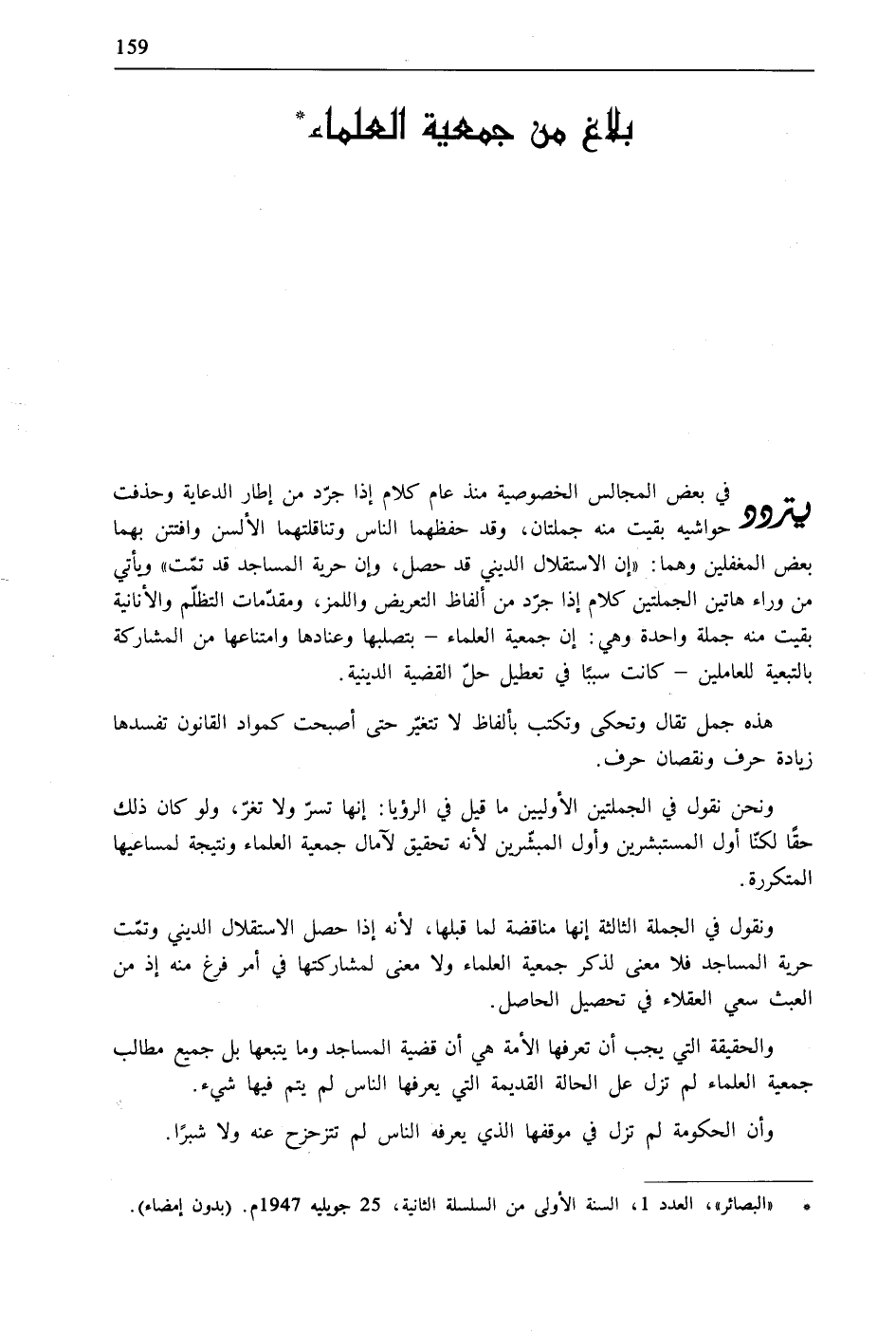 "البصائر"، العدد 1، السنة الأولى من السلسلة الثانية، 25 جويليه 1947م. (بدون إمضاء).