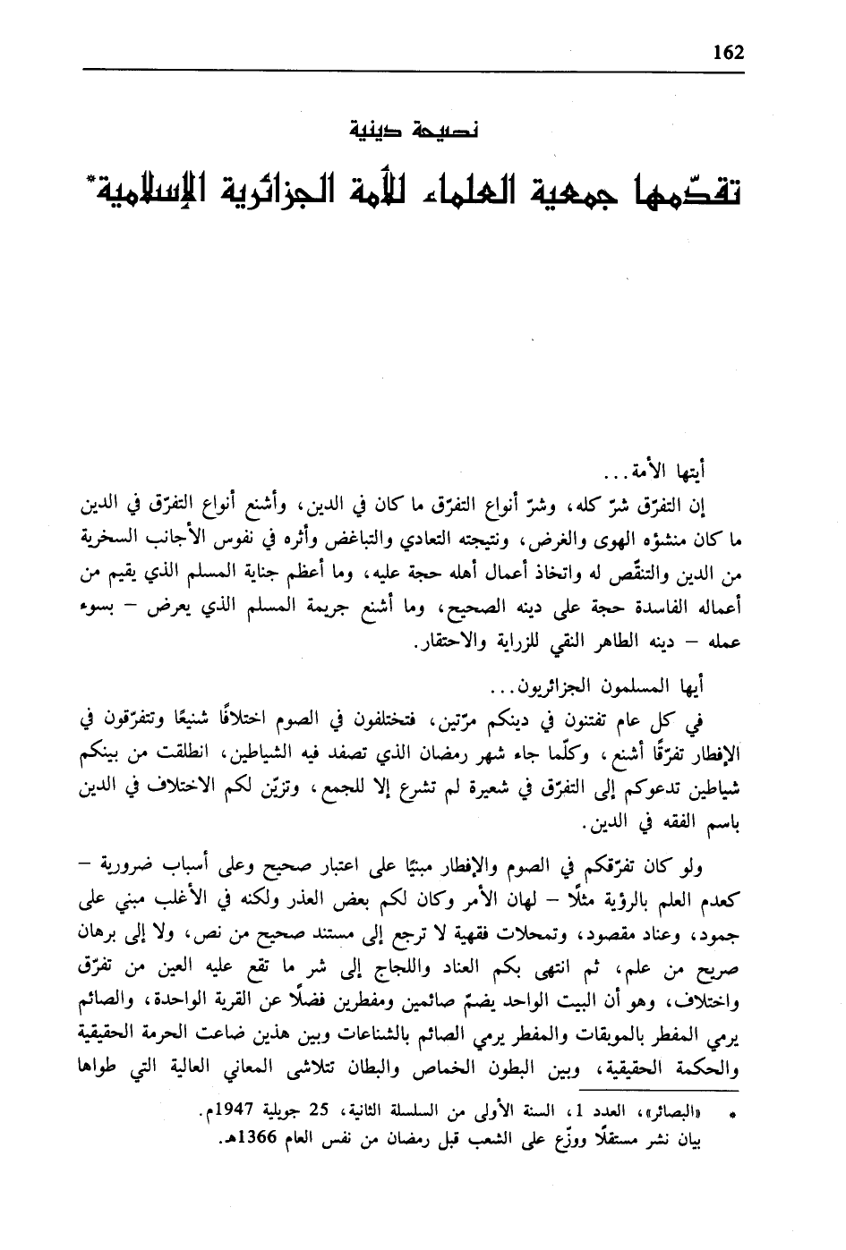 * "البصائر"، العدد 1، السنة الأولى من السلسلة الثانية، 23 جويلية 1947م.