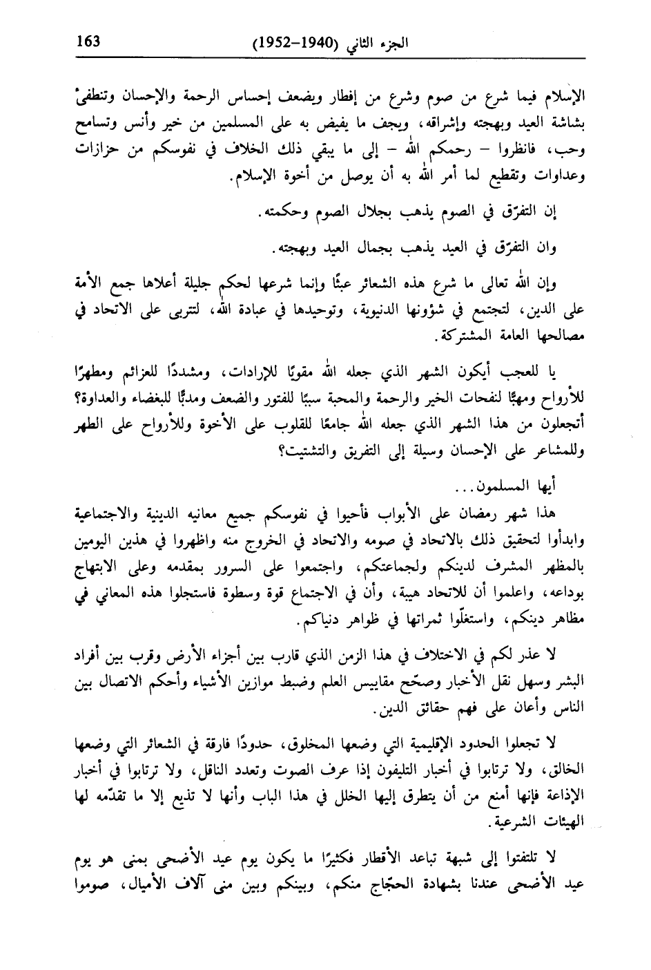 هذا شهر رمضان على الأبواب فأحيوا في نفوسكم جميع معانيه الدينية والاجتماعية وابدأوا لتحقيق ذلك بالاتحاد في صومه والاتحاد في الخروج منه وأظهروا في هذين اليومين بالمظهر المشرف لدينكم ولجماعتكم، واجتمعوا على السرور بمقدمه وعلى الابتهاج بوداعه، واعلموا أن للاتحاد هيبة، وأن في الاجتماع قوة وسطوة فاستجلوا هذه المعاني في مظاهر دينكم، واستغلّوا ثمراتها في ظواهر دنياكم.