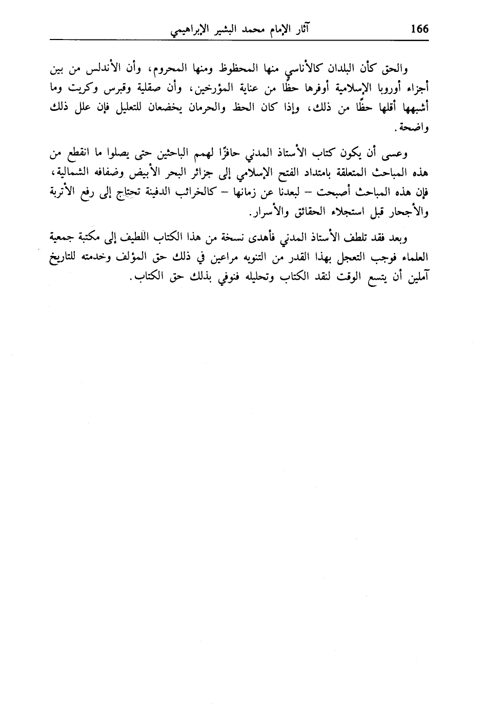 وبعد فقد تلطف الأستاذ المدني فأهدى نسخة من هذا الكتاب اللطيف إلى مكتبة جمعية العلماء فوجب التعجل بهذا القدر من التنويه مراعين في ذلك حق المؤلف وخدمته للتاريخ آملين أن يتسع الوقت لنقد الكتاب وتحليله فنوفي بذلك حق الكتاب.