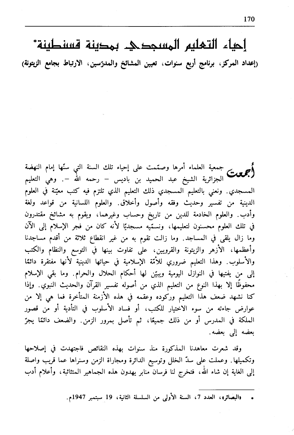 * "البصائر"، العدد 7، السنة الأولى من السلسلة الثانية، 19 سبتمبر 1947م.