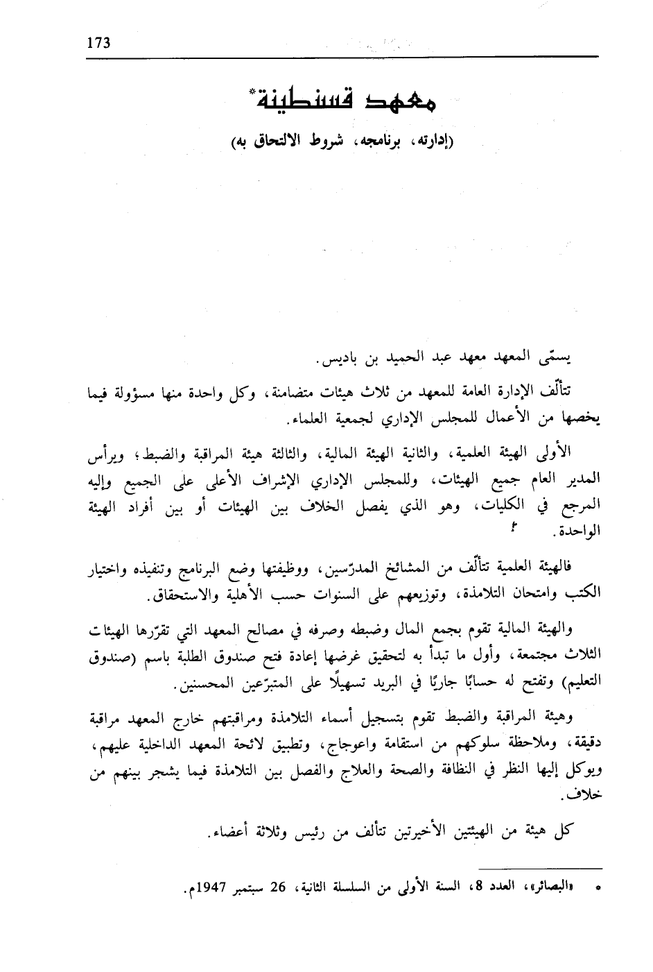 * "البصائر"، العدد 8، السنة الأولى من السلسلة الثانية، 26 سبتمبر 1947م.