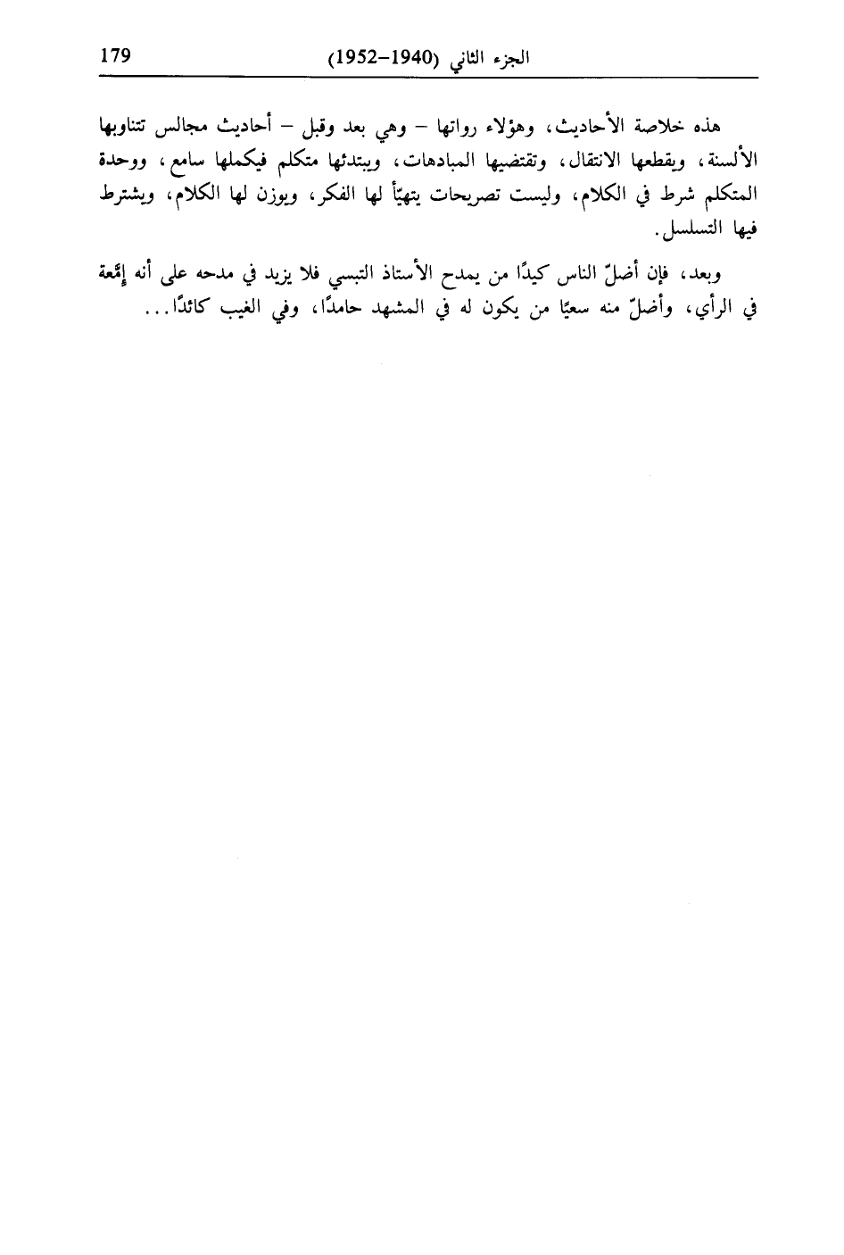 هذه خلاصة الأحاديث، وهؤلاء رواتها- وهي بعد وقبل- أحاديث مجالس تتناوبها الألسنة، ويقطعها الانتقال، وتقتضيها المبادهات، ويبتدئها متكلم فيكملها سامع، ووحدة المتكلم شرط في الكلام، وليست تصريحات يتهيّأ لها الفكر، ويوزن لها الكلام، ويشترط فيها التسلسل.