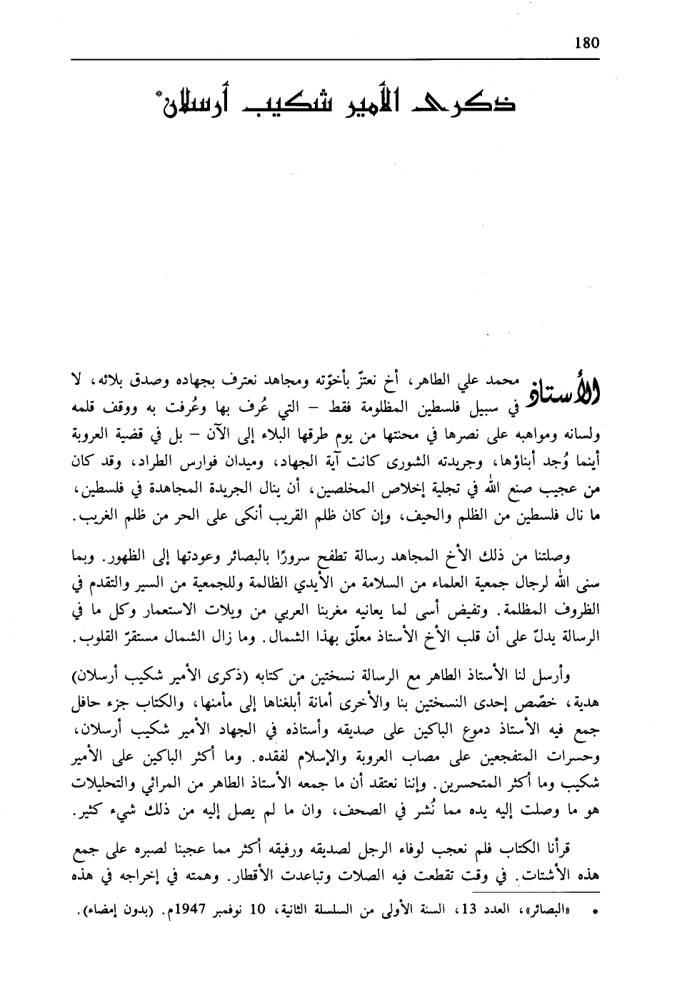 وأرسل لنا الأستاذ الطاهر مع الرسالة نسختين من كتابه (ذكرى الأمير شكيب أرسلان) هدية، خصّص إحدى النسختين بنا والأخرى أمانة أبلغناها إلى مأمنها، والكتاب جزء حافل جمع فيه الأستاذ دموع الباكين على صديقه وأستاذه في الجهاد الأمير شكيب أرسلان، وحسرات المتفجعين على مصاب العروبة والإسلام لفقده. وما أكثر الباكين على الأمير شكيب وما أكثر المتحسرين. وإننا نعتقد أن ما جمعه الأستاذ الطاهر من المراثي والتحليلات هو ما وصلت إليه يده مما نُشر في الصحف، وان ما لم يصل إليه من ذلك شيء كثير.