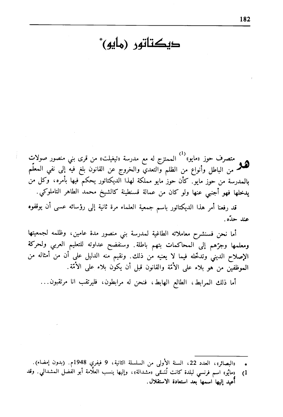 هو متصرف حوز "مايو" (1) الممتزج له مع مدرسة "تيغيلت" من قرى بني منصور صولات من الباطل وأنواع من الظلم والتعدي والخروج عن القانون بلغ فيه إلى نفي المعلّم بالمدرسة من حوز مايو. كأن حوز مايو مملكة لهذا الديكتاتور يحكم فيها بأمره، وكل من يدخلها فهو أجنبي عنها ولو كان من عمالة قسنطينة كالشيخ محمد الطاهر التاملوكي.