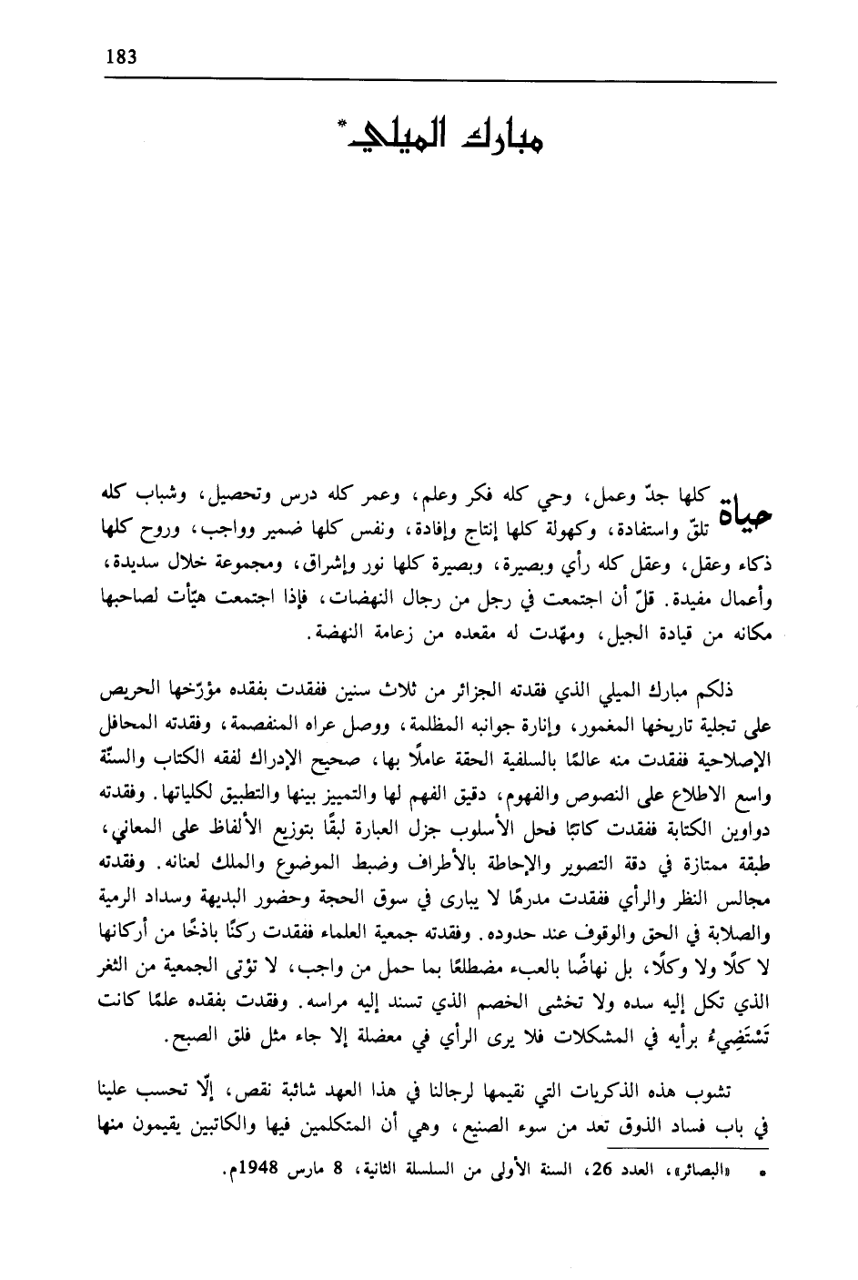 ذلكم مبارك الميلي الذي فقدته الجزائر من ثلاث سنين ففقدت بفقده مؤرّخها الحريص على تجلية تاريخها المغمور، وإنارة جوانبه المظلمة، ووصل عراه المنفصمة، وفقدته المحافل الإصلاحية ففقدت منه عالمًا بالسلفية الحقة عاملًا بها، صحيح الإدراك لفقه الكتاب والسنّة واسع الاطلاع على النصوص والفهوم، دقيق الفهم لها والتمييز بينها والتطبيق لكلياتها. وفقدته دواوين الكتابة ففقدت كاتبًا فحل الأسلوب جزل العبارة لبقًا بتوزيع الألفاظ على المعاني، طبقة ممتازة في دقة التصوير والإحاطة بالأطراف وضبط الموضوع والملك لعنانه. وفقدته مجالس النظر والرأي ففقدت مدرهًا لا يبارى في سوق الحجة وحضور البديهة وسداد الرمية والصلابة في الحق والوقوف عند حدوده. وفقدته جمعية العلماء ففقدت ركنًا باذخًا من أركانها لا كلًا ولا وكلًا، بل نهاضًا بالعبء مضطلعًا بما حمل من واجب، لا تؤتى الجمعية من الثغر الذي تكل إليه سده ولا تخشى الخصم الذي تسند إليه مراسه. وفقدت بفقده علمًا كانت تَسْتَضِيءُ برأيه في المشكلات فلا يرى الرأي في معضلة إلا جاء مثل فلق الصبح.