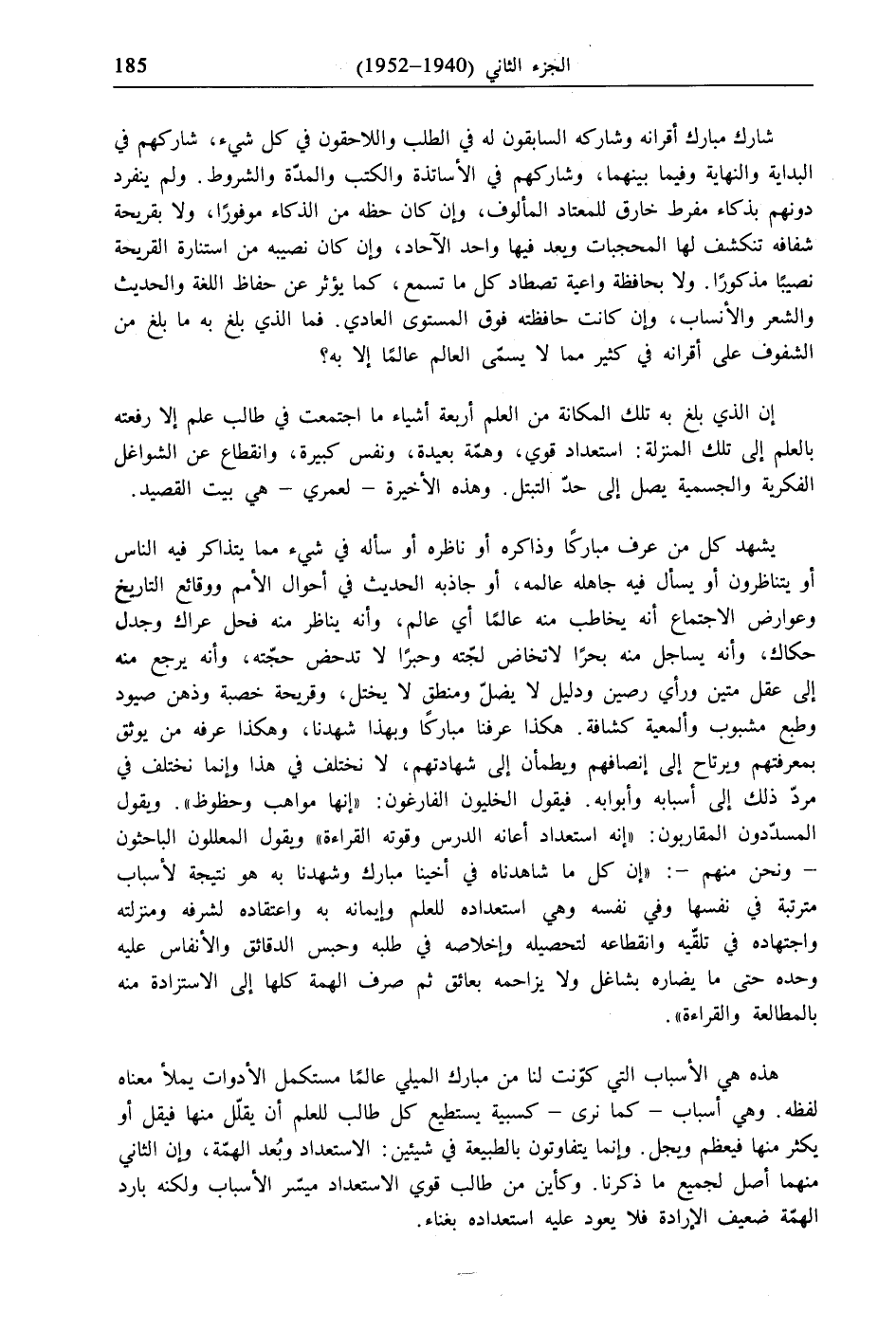 يشهد كل من عرف مباركًا وذاكره أو ناظره أو سأله في شيء مما يتذاكر فيه الناس أو يتناظرون أو يسأل فيه جاهله عالمه، أو جاذبه الحديث في أحوال الأمم ووقائع التاريخ وعوارض الاجتماع أنه يخاطب منه عالمًا أي عالم، وأنه يناظر منه فحل عراك وجدل حكاك، وأنه يساجل منه بحرًا لا تخاض لجّته وحبرًا لا تدحض حجّته، وأنه يرجع منه إلى عقل متين ورأي رصين ودليل لا يضلّ ومنطق لا يختل، وقريحة خصبة وذهن صيود وطبع مشبوب وألمعية كشافة. هكذا عرفنا مباركًا وبهذا شهدنا، وهكذا عرفه من يوثق بمعرفتهم ويرتاح إلى إنصافهم ويطمأن إلى شهادتهم، لا نختلف في هذا وإنما نختلف في مردّ ذلك إلى أسبابه وأبوابه. فيقول الخليون الفارغون: "إنها مواهب وحظوظ". ويقول المسدّدون المقاربون: "إنه استعداد أعانه الدرس وقوته القراءة" ويقول المعللون الباحثون -ونحن منهم-: "إن كل ما شاهدناه في أخينا مبارك وشهدنا به هو نتيجة لأسباب مترتبة في نفسها وفي نفسه وهي استعداده للعلم وإيمانه به واعتقاده لشرفه ومنزلته واجتهاده في تلقّيه وانقطاعه لتحصيله وإخلاصه في طلبه وحبس الدقائق والأنفاس عليه وحده حتى ما يضاره بشاغل ولا يزاحمه بعائق ثم صرف الهمة كلها إلى الاستزادة منه بالمطالعة والقراءة".