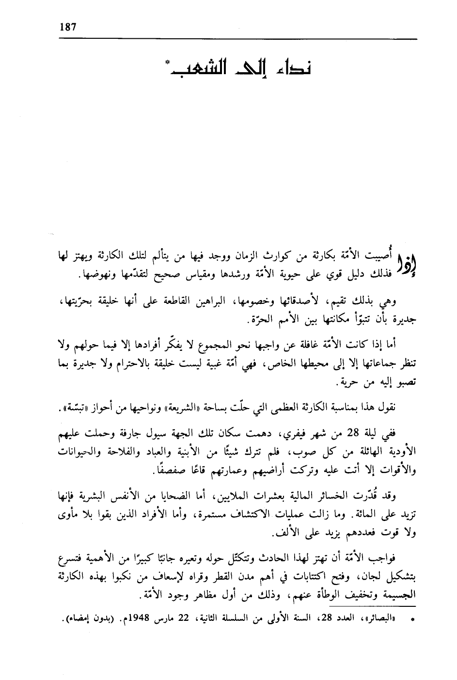 * "البصائر"، العدد 28، السنة الأولى من السلسلة الثانية، 22 مارس 1948م. (بدون إمضاء).