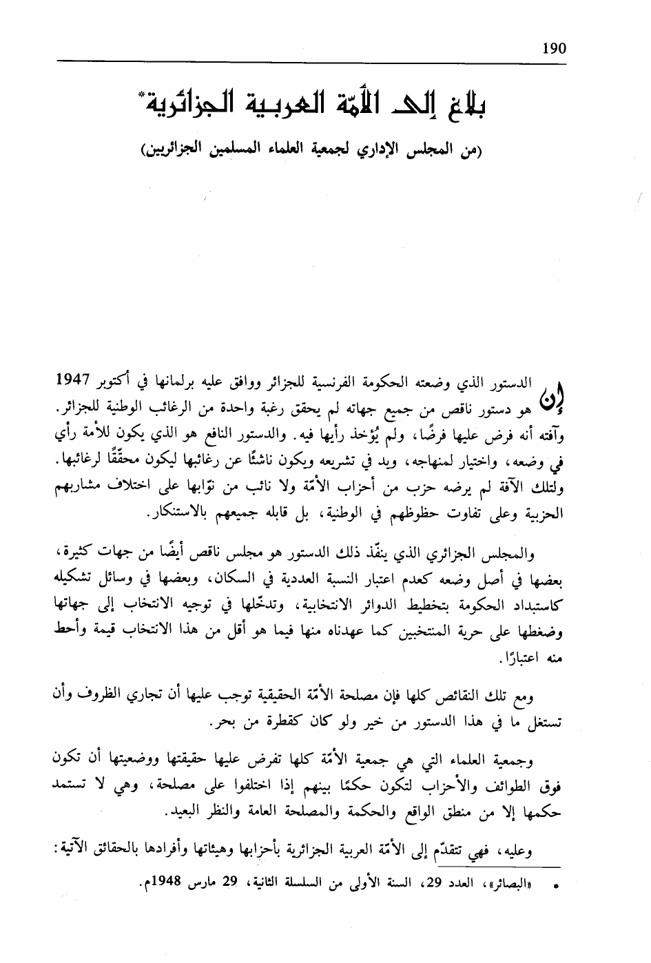 * "البصائر"، العدد 29، السنة الأولى من السلسلة الثانية، 29 مارس 1948م.
