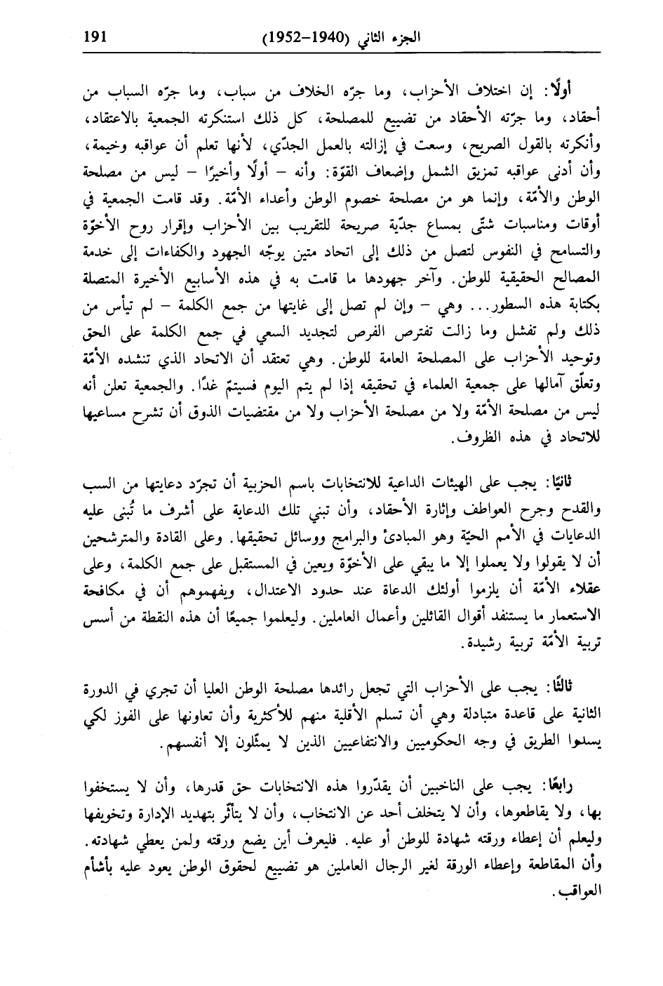 أولًا: إن اختلاف الأحزاب، وما جرّه الخلاف من سباب، وما جرّه السباب من أحقاد، وما جرّته الأحقاد من تضييع للمصلحة، كل ذلك استنكرته الجمعية بالاعتقاد، وأنكرته بالقول الصريح، وسعت في إزالته بالعمل الجدّي، لأنها تعلم أن عواقبه وخيمة، وأن أدنى عواقبه تمزيق الشمل وإضعاف القوّة: وأنه- أولًا وأخيرًا- ليس من مصلحة الوطن والأمّة، وإنما هو من مصلحة خصوم الوطن وأعداء الأمّة. وقد قامت الجمعية في أوقات ومناسبات شتّى بمساع جدّية صريحة للتقريب بين الأحزاب وإقرار روح الأخوّة والتسامح في النفوس لتصل من ذلك إلى اتحاد متين يوجّه الجهود والكفاءات إلى خدمة المصالح الحقيقية للوطن. وآخر جهودها ما قامت به في هذه الأسابيع الأخيرة المتصلة بكتابة هذه السطور ... وهي- وإن لم تصل إلى غايتها من جمع الكلمة- لم تيأس من ذلك ولم تفشل وما زالت تفترص الفرص لتجديد السعي في جمع الكلمة على الحق وتوحيد الأحزاب على المصلحة العامة للوطن. وهي تعتقد أن الاتحاد الذي تنشده الأمّة وتعلّق آمالها على جمعية العلماء في تحقيقه إذا لم يتم اليوم فسيتمّ غدًا. والجمعية تعلن أنه ليس من مصلحة الأمّة ولا من مصلحة الأحزاب ولا من مقتضيات الذوق أن تشرح مساعيها للاتحاد في هذه الظروف.