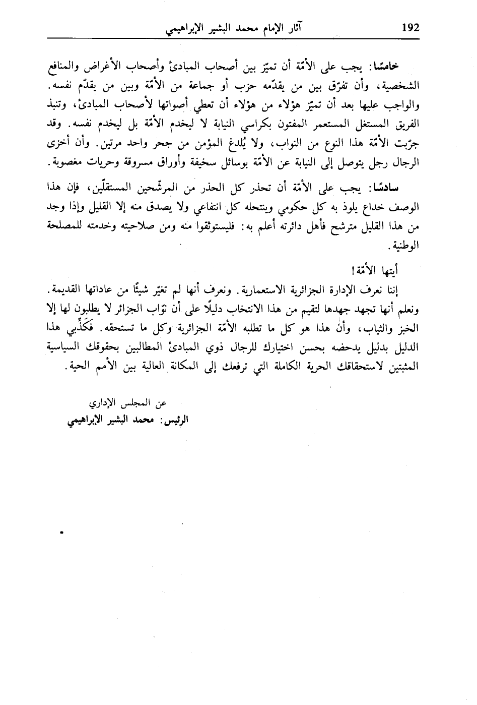 إننا نعرف الإدارة الجزائرية الاستعمارية. ونعرف أنها لم تغيّر شيئًا من عاداتها القديمة. ونعلم أنها تجهد جهدها لتقيم من هذا الانتخاب دليلًا على أن نوّاب الجزائر لا يطلبون لها إلا الخبز والثياب، وأن هذا هو كل ما تطلبه الأمّة الجزائرية وكل ما تستحقه. فَكَذِّبي هذا الدليل بدليل يدحضه بحسن اختيارك للرجال ذوي المبادئ المطالبين بحقوقك السياسية المثبتين لاستحقاقك الحرية الكاملة التي ترفعك إلى المكانة العالية بين الأمم الحية.