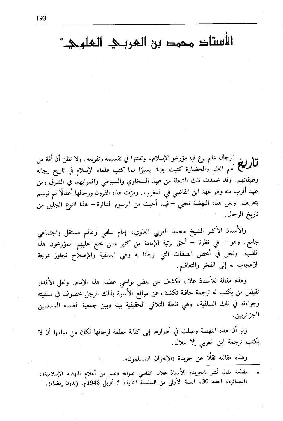 وهذه مقالة للأستاذ علال تكشف عن بعض نواحي عظمة هذا الإمام. ولعل الأقدار تقيض من يكتب له ترجمة حافلة تكشف عن مواقع الأسوة بذلك الرجل خصوصًا في سلفيته وجراءته في تلك السلفية، وهي نقطة التلاقي الحقيقية بينه وبين جمعية العلماء المسلمين الجزائريين.