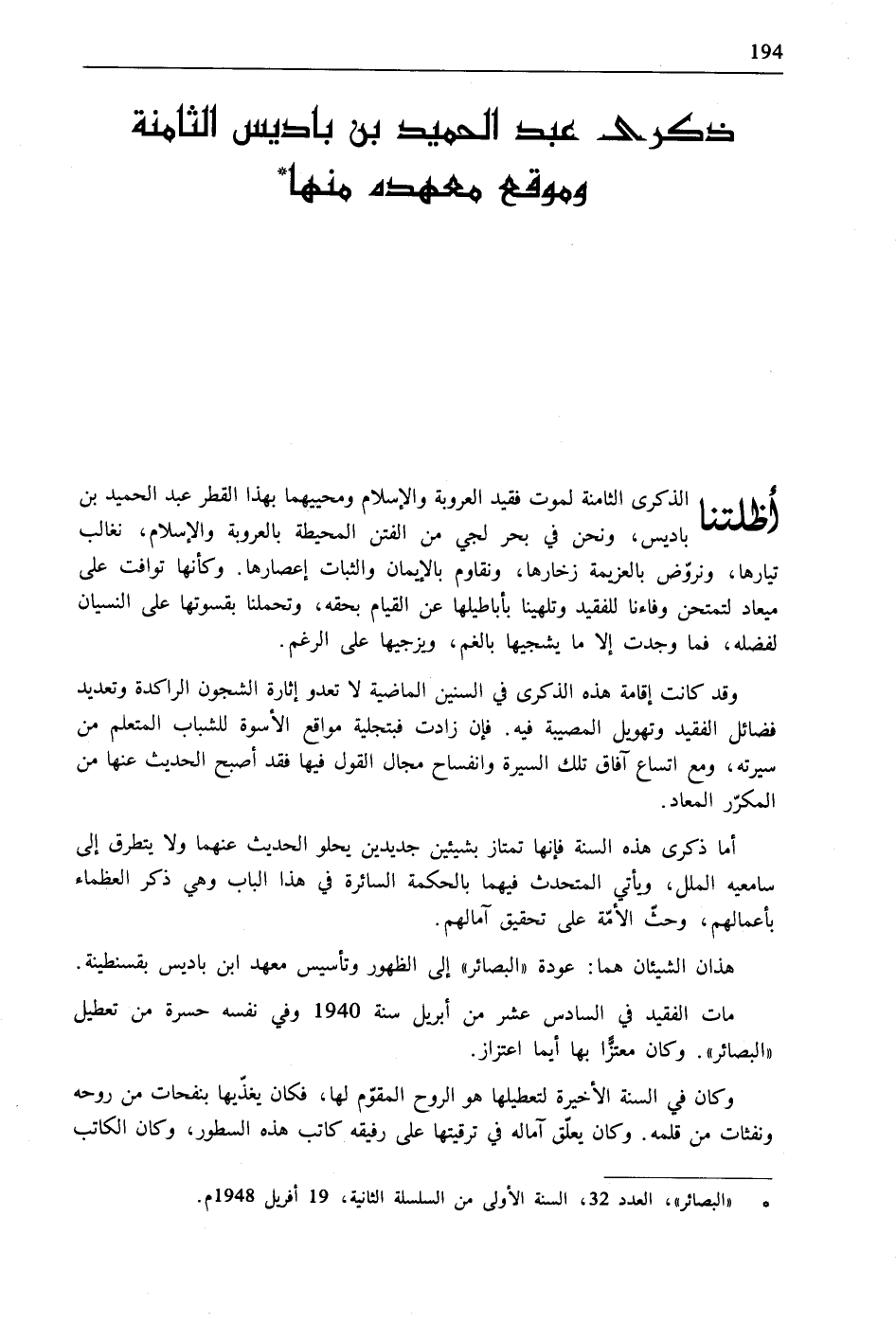 أظلتنا الذكرى الثامنة لموت فقيد العروبة والإسلام ومحييهما بهذا القطر عبد الحميد بن باديس، ونحن في بحر لجي من الفتن المحيطة بالعروبة والإسلام، نغالب