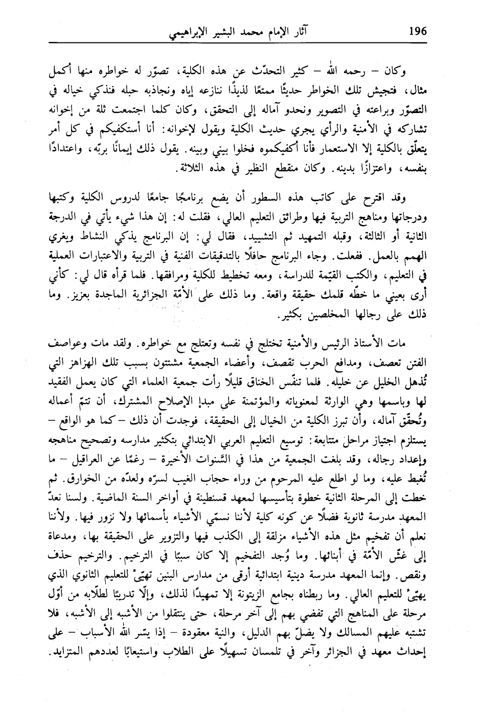 وقد اقترح على كاتب هذه السطور أن يضع برنامجًا جامعًا لدروس الكلية وكتبها ودرجاتها ومناهج التربية فيها وطرائق التعليم العالي، فقلت له: إن هذا شيء يأتي في الدرجة الثانية أو الثالثة، وقبله التمهيد ثم التشييد، فقال لي: إن البرنامج يذكي النشاط ويغري الهمم بالعمل. ففعلت. وجاء البرنامج حافلًا بالتدقيقات الفنية في التربية والاعتبارات العملية في التعليم، والكتب القيّمة للدراسة، ومعه تخطيط للكلية ومرافقها. فلما قرأه قال لي: كأني أرى بعيني ما خطّه قلمك حقيقة واقعة. وما ذلك على الأمّة الجزائرية الماجدة بعزيز. وما ذلك على رجالها المخلصين بكثير.
