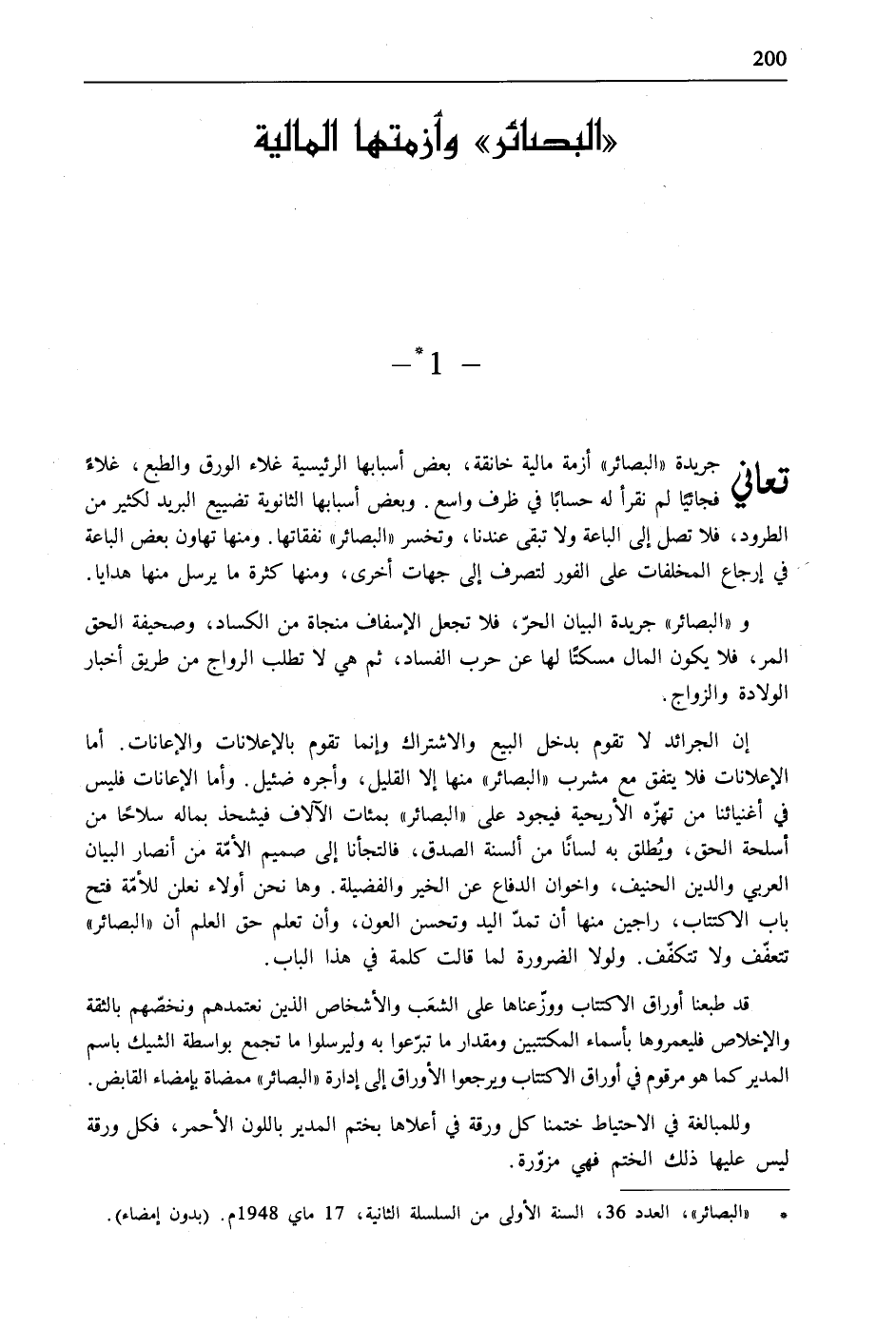 إن الجرائد لا تقوم بدخل البيع والاشتراك وإنما تقوم بالإعلانات والإعانات. أما الإعلانات فلا يتفق مع مشرب "البصائر" منها إلا القليل، وأجره ضئيل. وأما الإعانات فليس في أغنيائنا من تهزّه الأريحية فيجود على "البصائر" بمئات الآلاف فيشحذ بماله سلاحًا من أسلحة الحق، ويُطلق به لسانًا من ألسنة الصدق، فالتجأنا إلى صميم الأمّة من أنصار البيان العربي والدين الحنيف، واخوان الدفاع عن الخير والفضيلة. وها نحن أولاء نعلن للأمّة فتح باب الاكتتاب، راجين منها أن تمدّ اليد وتحسن العون، وأن تعلم حق العلم أن "البصائر" تتعفّف ولا تتكفّف. ولولا الضرورة لما قالت كلمة في هذا الباب.