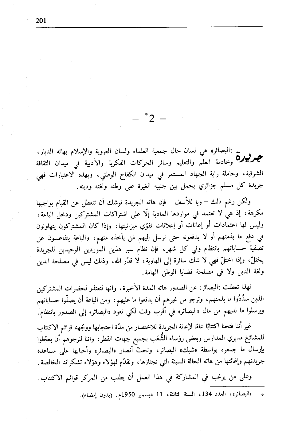 غير أننا فتحنا اكتتابًا عامًا لإعانة الجريدة للاختصار من مدّة احتجابها ووجّهنا قوائم الاكتتاب للمشائخ مديري المدارس وبعض رؤساء الشّعَب بجميع جهات القطر، وإننا لنرجوهم أن يعجّلوا بإرسال ما جمعوه بواسطة "شيك" البصائر، ونحثّ أنصار "البصائر" وأحبابها على مساعدة جريدتهم وإغاثتها من هاته الحالة السيئة التي تجتازها، ونقدّم لهؤلاء وهؤلاء تشكراتنا الخالصة. وعلى من يرغب في المشاركة في هذا العمل أن يطلب من المركز قوائم الاكتتاب.