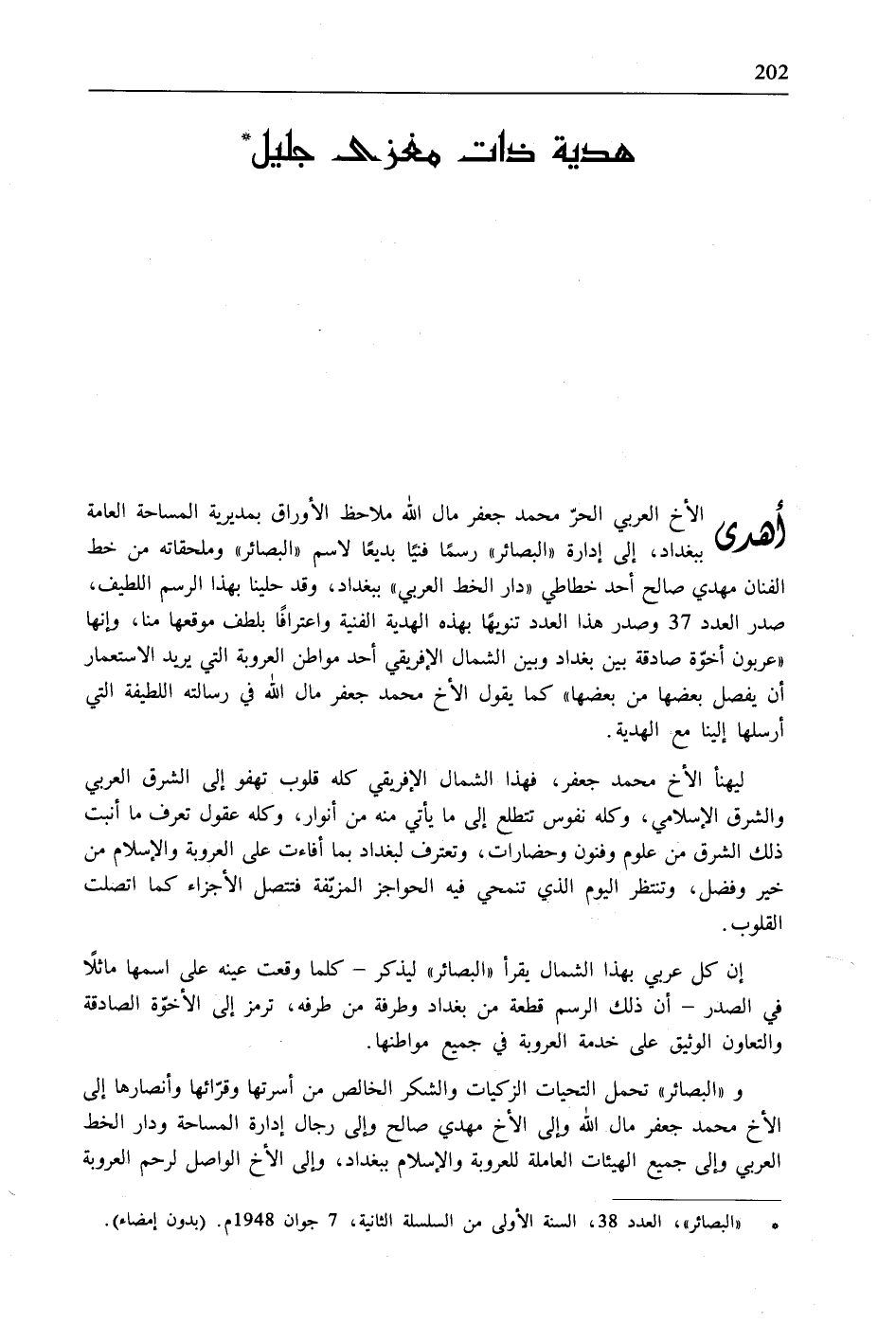 أهدى الأخ العربي الحرّ محمد جعفر مال الله ملاحظ الأوراق بمديرية المساحة العامة ببغداد، إلى إدارة "البصائر" رسمًا فنيًا بديعًا لاسم "البصائر" وملحقاته من خط الفنان مهدي صالح أحد خطاطي "دار الخط العربي" ببغداد، وقد حلينا بهذا الرسم اللطيف، صدر العدد 37 وصدر هذا العدد تنويهًا بهذه الهدية الفنية واعترافًا بلطف موقعها منا، وإنها "عربون أخوّة صادقة بين بغداد وبين الشمال الإفريقي أحد مواطن العروبة التي يريد الاستعمار أن يفصل بعضها من بعضها" كما يقول الأخ محمد جعفر مال الله في رسالته اللطيفة التي أرسلها إلينا مع الهدية.
