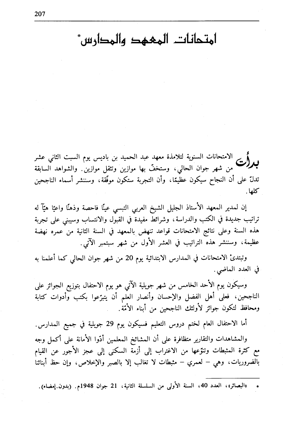 إن لمدير المعهد الأستاذ الجليل الشيخ العربي التبسي عينًا فاحصة وذهنًا واعيًا هيّآ له تراتيب جديدة في الكتب والدراسة، وشرائط مفيدة في القبول والانتساب وسيبني على تجربة هذه السنة وعلى نتائج الامتحانات قواعد تنهض بالمعهد في السنة الثانية من عمره نهضة عظيمة، وسننشر هذه التراتيب في العشر الأول من شهر سبتمبر الآتي.