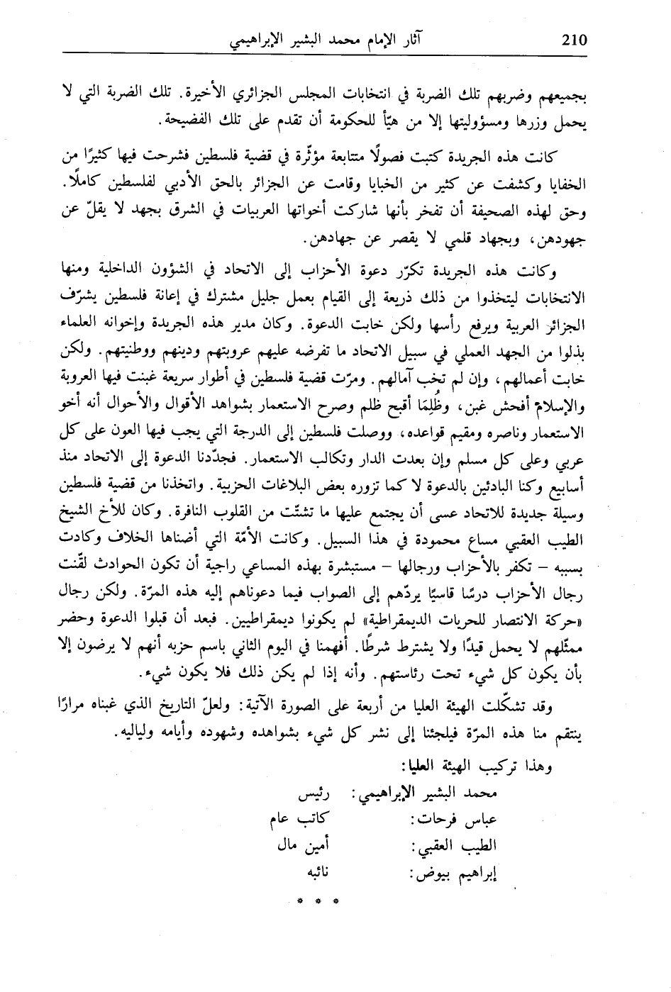 وكانت هذه الجريدة تكرّر دعوة الأحزاب إلى الاتحاد في الشؤون الداخلية ومنها الانتخابات ليتخذوا من ذلك ذريعة إلى القيام بعمل جليل مشترك في إعانة فلسطين يشرّف الجزائر العربية ويرفع رأسها ولكن خابت الدعوة. وكان مدير هذه الجريدة وإخوانه العلماء بذلوا من الجهد العملي في سبيل الاتحاد ما تفرضه عليهم عروبتهم ودينهم ووطنيتهم. ولكن خابت أعمالهم، وإن لم تخب آمالهم. ومرّت قضية فلسطين في أطوار سريعة غبنت فيها العروبة والإسلام أفحش غبن، وظُلِمَا أقبح ظلم وصرح الاستعمار بشواهد الأقوال والأحوال أنه أخو الاستعمار وناصره ومقيم قواعده، ووصلت فلسطين إلى الدرجة التي يجب فيها العون على كل عربي وعلى كل مسلم وان بعدت الدار وتكالب الاستعمار. فجدّدنا الدعوة إلى الاتحاد منذ أسابيع وكنا البادئين بالدعوة لا كما تزوره بعض البلاغات الحزبية. واتخذنا من قضية فلسطين وسيلة جديدة للاتحاد عسى أن يجتمع عليها ما تشتّت من القلوب النافرة. وكان للأخ الشيخ الطيب العقبي مساع محمودة في هذا السبيل. وكانت الأمّة التي أضناها الخلاف وكادت بسببه- تكفر بالأحزاب ورجالها- مستبشرة بهذه المساعي راجية أن تكون الحوادث لقّنت رجال الأحزاب درسًا قاسيًا يردّهم إلى الصواب فيما دعوناهم إليه هذه المرّة. ولكن رجال "حركة الانتصار للحريات الديمقراطية" لم يكونوا ديمقراطيين. فبعد أن قبلوا الدعوة وحضر ممثّلهم لا يحمل قيدًا ولا يشترط شرطًا. أفهمنا في اليوم الثاني باسم حزبه أنهم لا يرضون إلا بأن يكون كل شيء تحت رئاستهم. وأنه إذا لم يكن ذلك فلا يكون شيء.