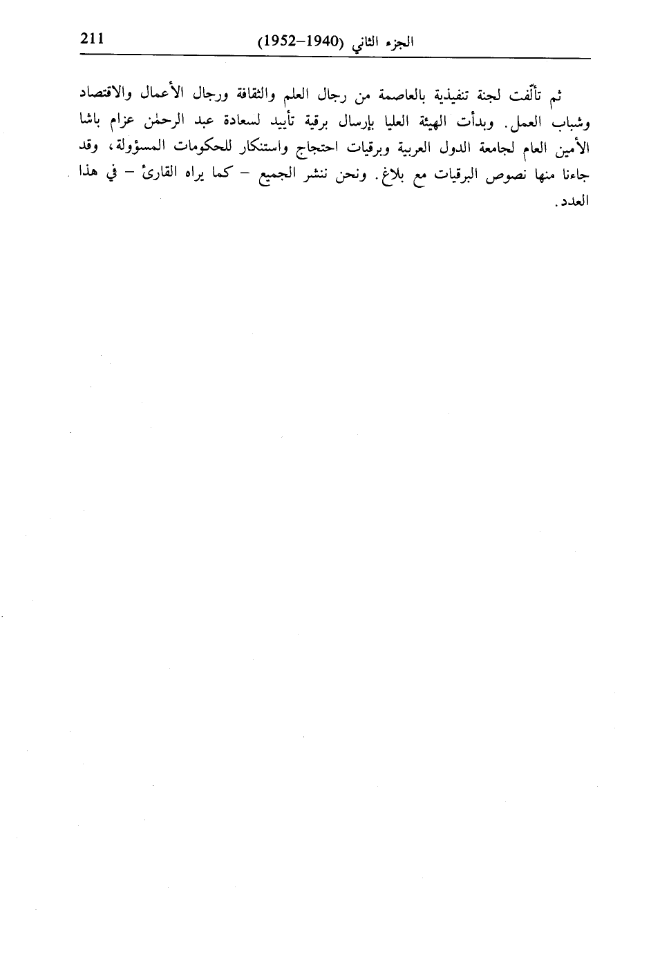 ثم تألّفت لجنة تنفيذية بالعاصمة من رجال العلم والثقافة ورجال الأعمال والاقتصاد وشباب العمل. وبدأت الهيئة العليا بإرسال برقية تأييد لسعادة عبد الرحمن عزام باشا الأمين العام لجامعة الدول العربية وبرقيات احتجاج واستنكار للحكومات المسؤولة، وقد جاءنا منها نصوص البرقيات مع بلاغ. ونحن ننشر الجميع- كما يراه القارئ- في هذا العدد.
