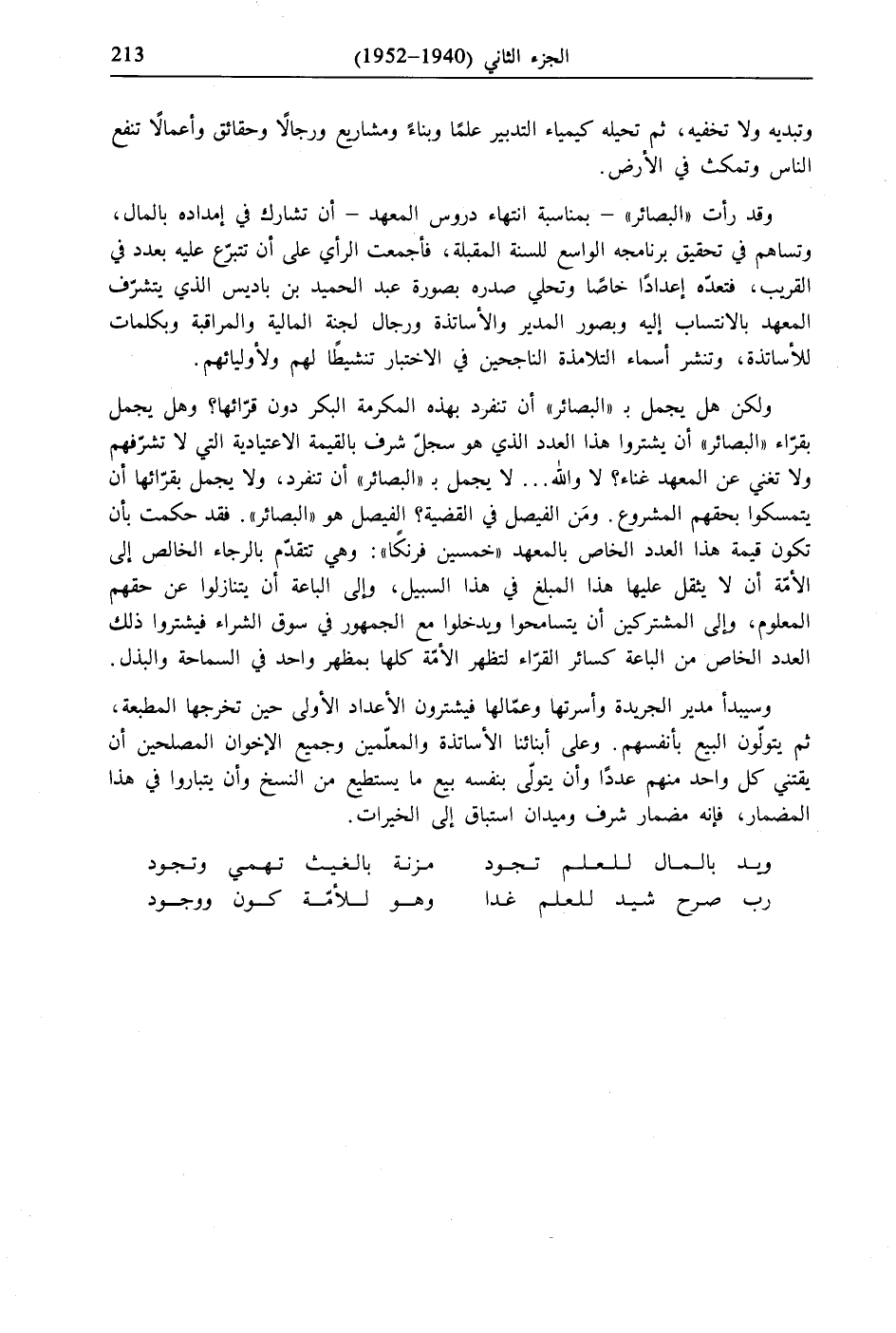 ولكن هل يجمل بـ "البصائر" أن تنفرد بهذه المكرمة البكر دون قرّائها؟ وهل يجمل بقرّاء "البصائر" أن يشتروا هذا العدد الذي هو سجلّ شرف بالقيمة الاعتيادية التي لا تشرّفهم ولا تغني عن المعهد غناء؟ لا والله ... لا يجمل بـ "البصائر" أن تنفرد، ولا يجمل بقرّائها أن يتمسكوا بحقهم المشروع. ومَن الفيصل في القضية؟ الفيصل هو "البصائر". فقد حكمت بأن تكون قيمة هذا العدد الخاص بالمعهد "خمسين فرنكا": وهي تتقدّم بالرجاء الخالص إلى الأمّة أن لا يثقل عليها هذا المبلغ في هذا السبيل، وإلى الباعة أن يتنازلوا عن حقهم المعلوم، وإلى المشتركين أن يتسامحوا ويدخلوا مع الجمهور في سوق الشراء فيشتروا ذلك العدد الخاص من الباعة كسائر القرّاء لتظهر الأمّة كلها بمظهر واحد في السماحة والبذل. وسيبدأ مدير الجريدة وأسرتها وعمّالها فيشترون الأعداد الأولى حين تخرجها المطبعة، ثم يتولّون البيع بأنفسهم. وعلى أبنائنا الأساتذة والمعلّمين وجميع الإخوان المصلحين أن يقتني كل واحد منهم عددًا وأن يتولّى بنفسه بيع ما يستطيع من النسخ وأن يتباروا في هذا المضمار، فإنه مضمار شرف وميدان استباق إلى الخيرات.
