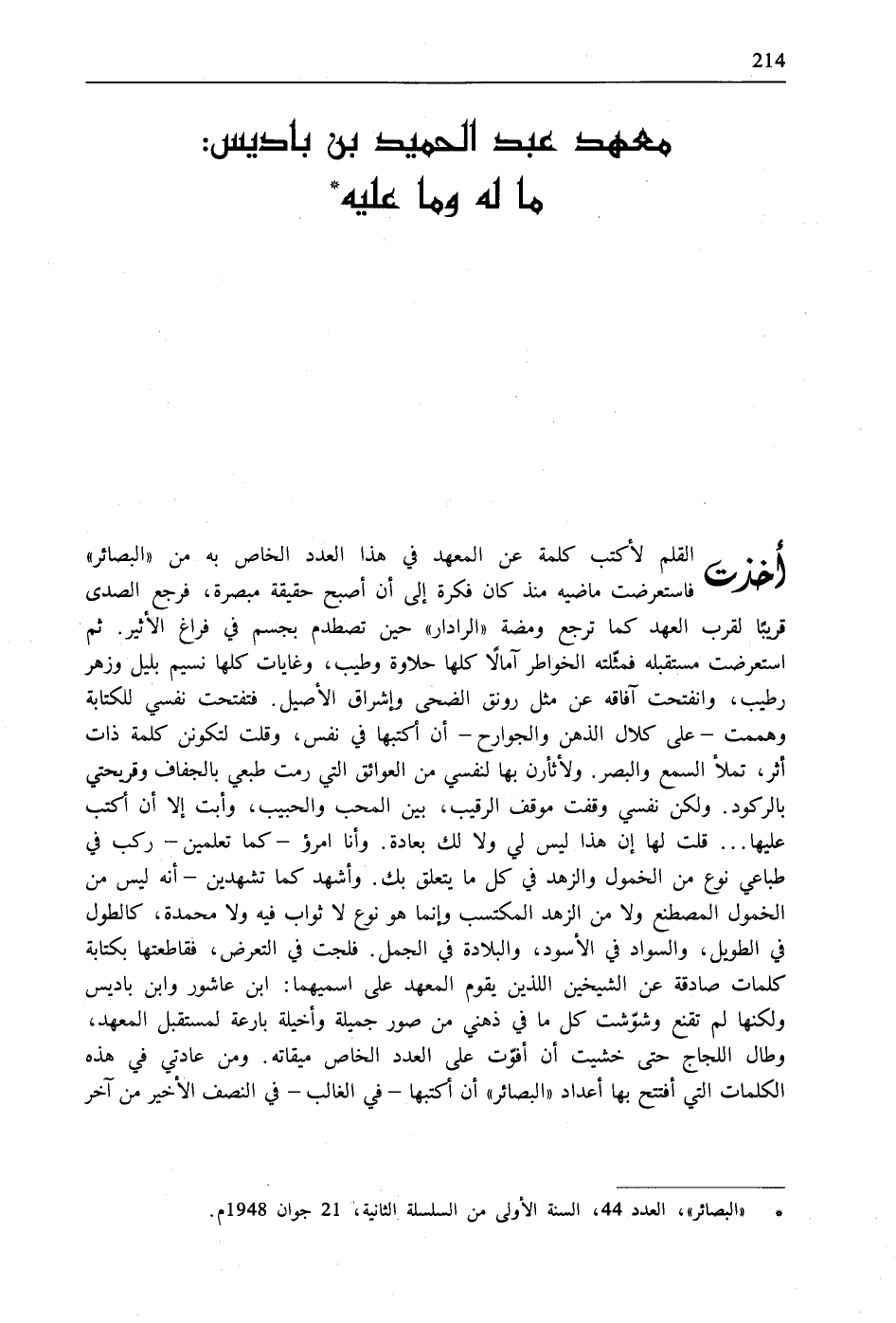 أخذت القلم لأكتب كلمة عن المعهد في هذا العدد الخاص به من "البصائر" فاستعرضت ماضيه منذ كان فكرة إلى أن أصبح حقيقة مبصرة، فرجع الصدى