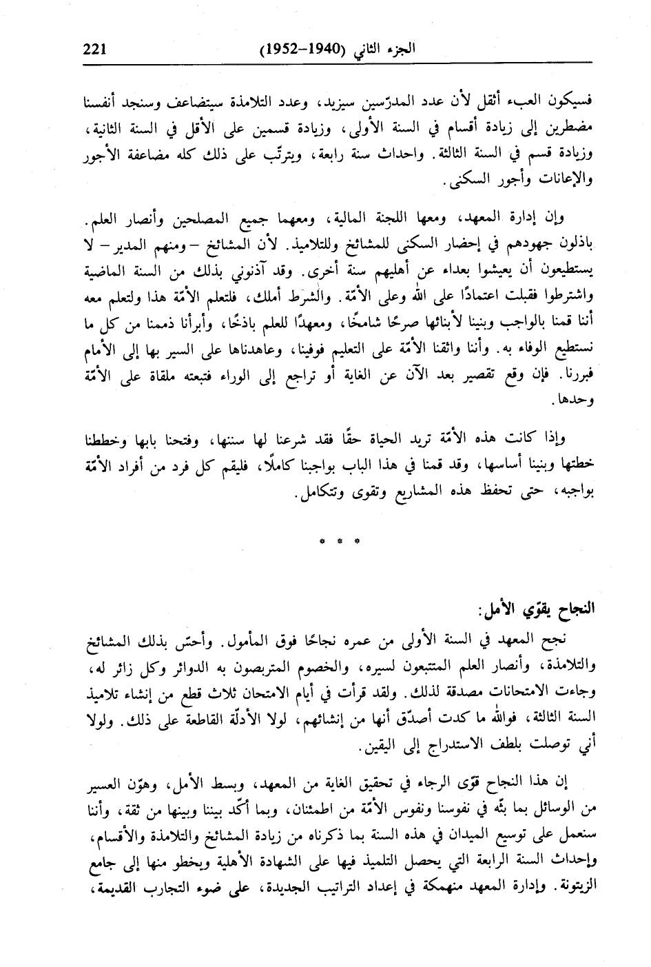 وان إدارة المعهد، ومعها اللجنة المالية، ومعهما جميع المصلحين وأنصار العلم باذلون جهودهم في إحضار السكنى للمشائخ وللتلاميذ. لأن المشائخ- ومنهم المدير- لا يستطيعون أن يعيشوا بعداء عن أهليهم سنة أخرى. وقد آذنوني بذلك من السنة الماضية واشترطوا فقبلت اعتمادًا على الله وعلى الأمّة. والشرط أملك، فلتعلم الأمّة هذا ولتعلم معه أننا قمنا بالواجب وبنينا لأبنائها صرحًا شامخًا، ومعهدًا للعلم باذخًا، وأبرأنا ذممنا من كل ما نستطيع الوفاء به. وأننا واثقنا الأمّة على التعليم فوفينا، وعاهدناها على السير بها إلى الأمام فبررنا. فإن وقع تقصير بعد الآن عن الغاية أو تراجع إلى الوراء فتبعته ملقاة على الأمّة وحدها.