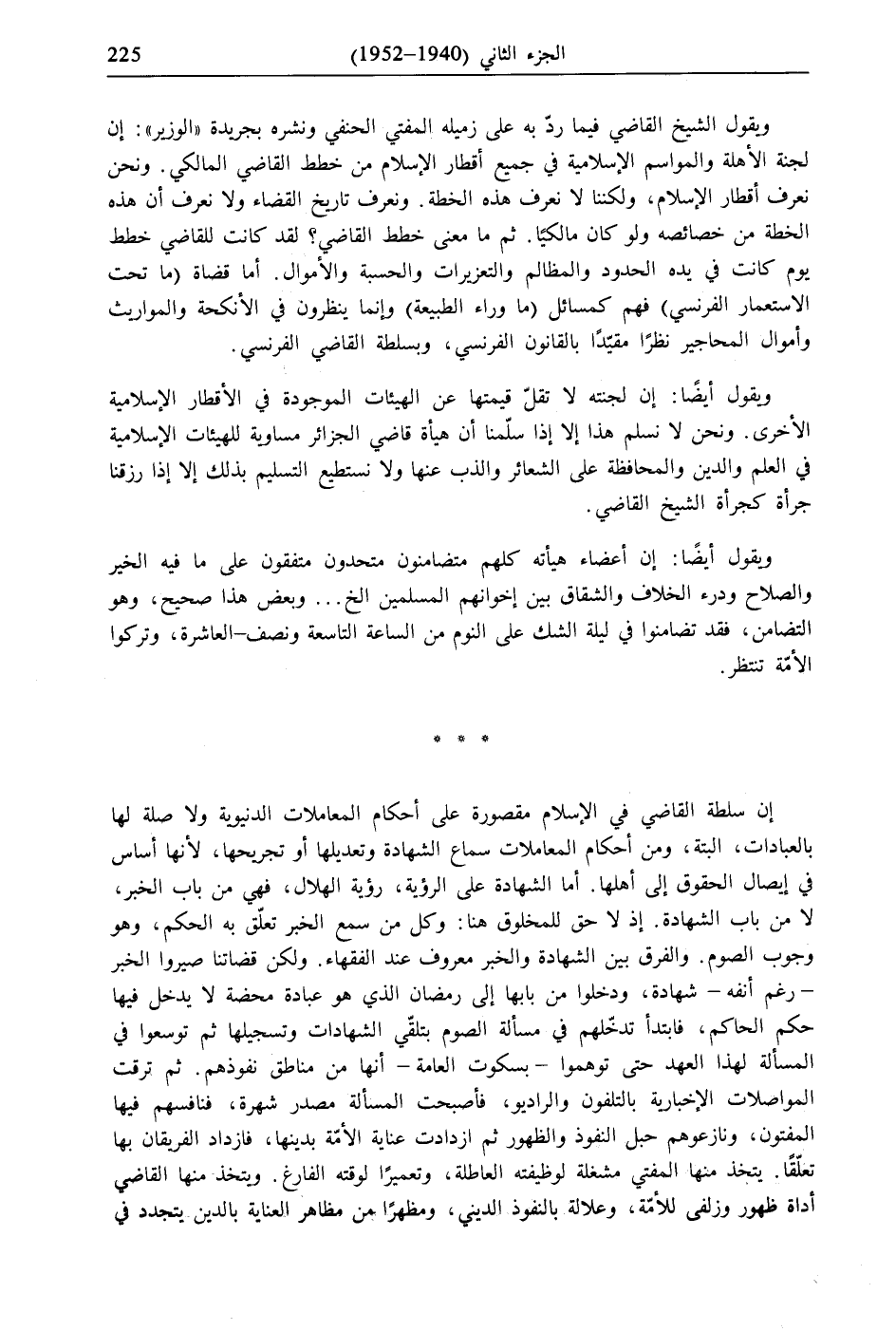 ويقول الشيخ القاضي فيما ردّ به على زميله المفتي الحنفي ونشره بجريدة "الوزبر": إن لجنة الأهلة والمواسم الإسلامية في جميع أقطار الإسلام من خطط القاضي المالكي. ونحن نعرف أقطار الإسلام، ولكننا لا نعرف هذه الخطة. ونعرف تاريخ القضاء ولا نعرف أن هذه الخطة من خصائصه ولو كان مالكيًا. ثم ما معنى خطط القاضي؟ لقد كانت للقاضي خطط يوم كانت في يده الحدود والمظالم والتعزيرات والحسبة والأموال. أما قضاة (ما تحت الاستعمار الفرنسي) فهم كمسائل (ما وراء الطبيعة) وإنما ينظرون في الأنكحة والمواربث وأموال المحاجير نظرًا مقيّدًا بالقانون الفرنسي، وبسلطة القاضي الفرنسي.