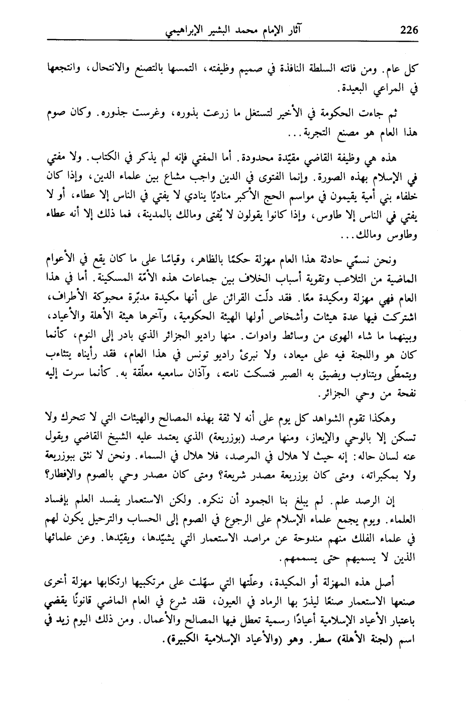 ونحن نسمّي حادثة هذا العام مهزلة حكمًا بالظاهر، وقياسًا على ما كان يقع في الأعوام الماضية من التلاعب وتقوية أسباب الخلاف بين جماعات هذه الأمّة المسكينة. أما في هذا العام فهي مهزلة ومكيدة معًا. فقد دلّت القرائن على أنها مكيدة مدبّرة محبوكة الأطراف، اشتركت فيها عدة هيئات وأشخاص أولها الهيئة الحكومية، وآخرها هيئة الأهلة والأعياد، وبينهما ما شاء الهوى من وسائط وأدوات. منها راديو الجزائر الذي بادر إلى النوم، كأنما كان هو واللجنة فيه على ميعاد، ولا نبرئ راديو تونس في هذا العام، فقد رأيناه يتثاءب ويتمطّى ويتناوب ويضيق به الصبر فتسكت نامته، وآذان سامعيه معلّقة به. كأنما سرت إليه نفحة من وحي الجزائر.