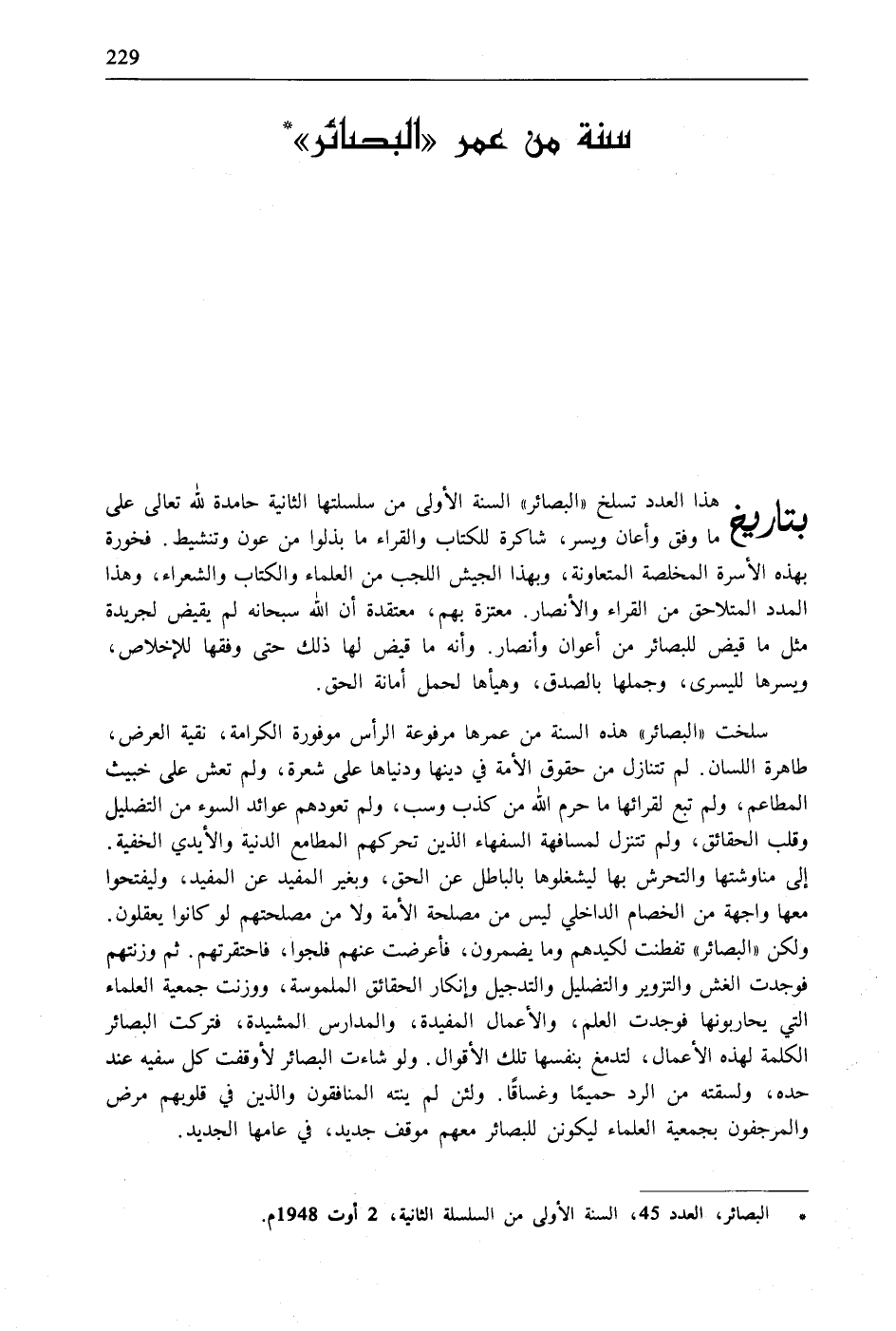 * "البصائر"، العدد 45، السنة الأولى من السلسلة الثانية، 2 أوت 1948م.
