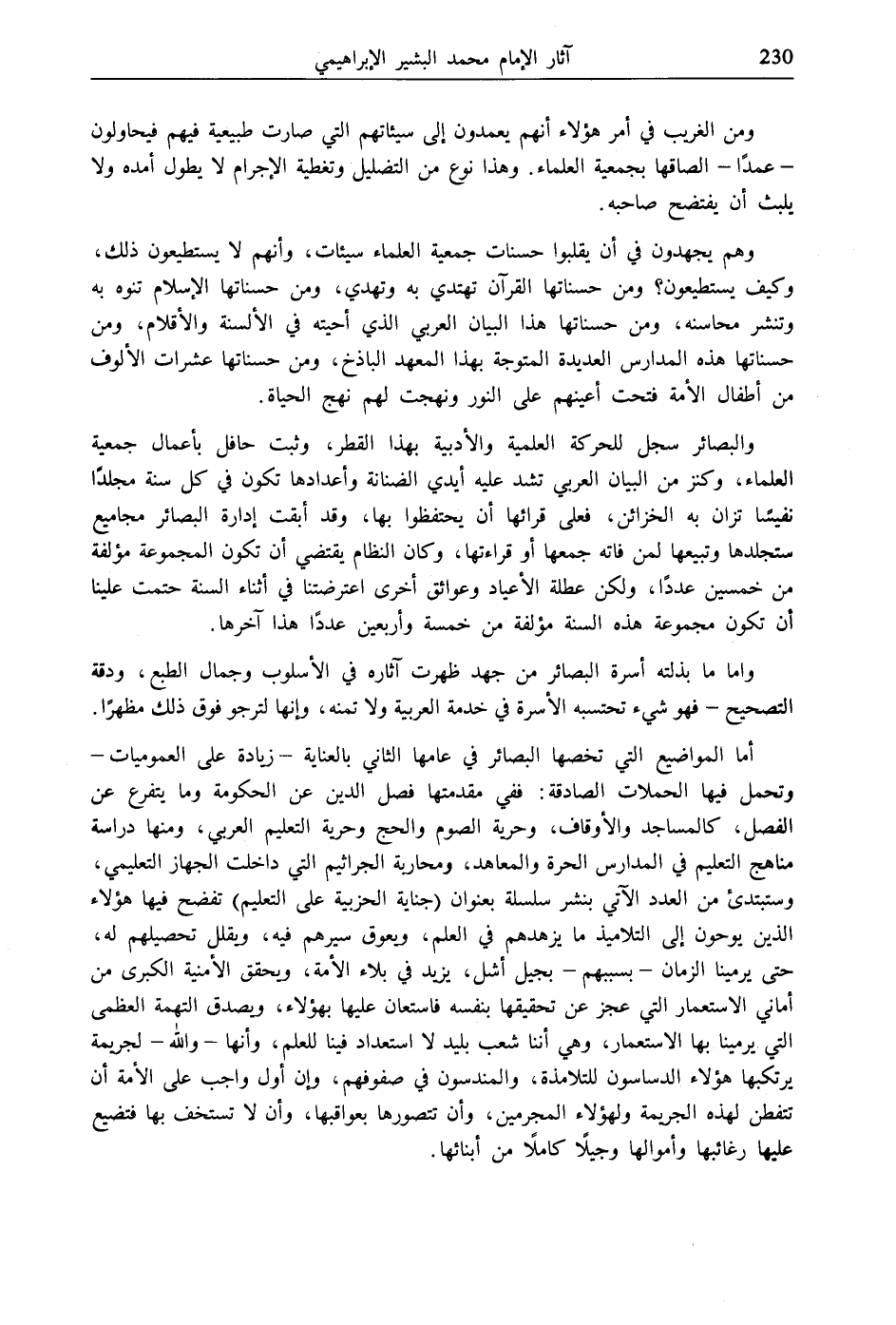 والبصائر سجل للحركة العلمية والأدبية بهذا القطر، وثبت حافل بأعمال جمعية العلماء، وكنز من البيان العربي تشد عليه أيدي الضنانة وأعدادها تكون في كل سنة مجلدًا نفيسًا تزان به الخزائن، فعلى قرائها أن يحتفظوا بها، وقد أبقت إدارة البصائر مجاميع ستجلدها وتبيعها لمن فاته جمعها أو قراءتها، وكان النظام يقتضي أن تكون المجموعة مؤلفة من خمسين عددًا، ولكن عطلة الأعياد وعوائق أخرى اعترضتنا في أثناء السنة حتمت علينا أن تكون مجموعة هذه السنة مؤلفة من خمسة وأربعين عددًا هذا آخرها.