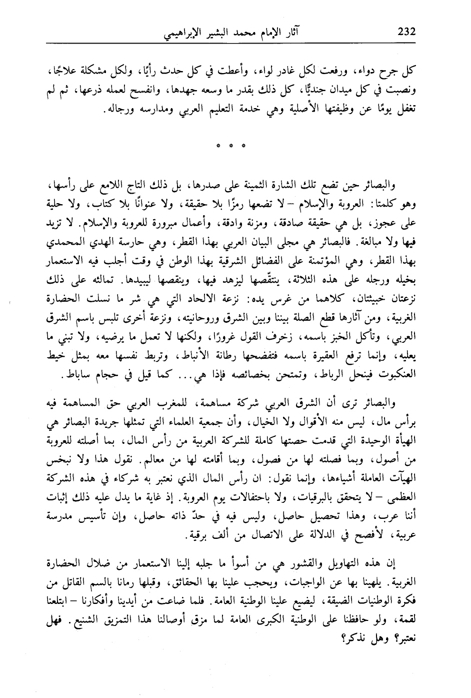 والبصائر ترى أن الشرق العربي شركة مساهمة، للمغرب العربي حق المساهمة فيه برأس مال، ليس منه الأقوال ولا الخيال، وأن جمعية العلماء التي تمثلها جريدة البصائر هي الهيأة الوحيدة التي قدمت حصتها كاملة للشركة العربية من رأس المال، بما أصلته للعروبة من أصول، وبما فصلته لها من فصول، وبما أقامته لها من معالم. نقول هذا ولا نبخس الهيآت العاملة أشياءها، وإنما نقول: ان رأس المال الذي نعتبر به شركاء في هذه الشركة العظمى- لا يتحقق بالبرقيات، ولا باحتفالات يوم العروبة. إذ غاية ما يدل عليه ذلك إثبات أننا عرب، وهذا تحصيل حاصل، وليس فيه في حدّ ذاته حاصل، وإن تأسيس مدرسة عربية، لأفصح في الدلالة على الاتصال من ألف برقية.