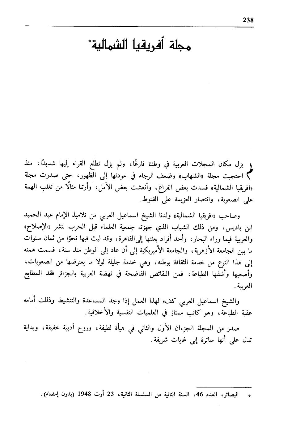 وصاحب "افريقيا الشمالية" ولدنا الشيخ اسماعيل العربي من تلاميذ الإمام عبد الحميد ابن باديس، ومن ذلك الشباب الذي جهزته جمعية العلماء قبل الحرب لنشر "الإصلاح" والعربية فيما وراء البحار، وأحد أفراد بعثتها إلى القاهرة، وقد لبث فيها نحوًا من ثمان سنوات ما بين الجامعة الأزهرية، والجامعة الأميريكية إلى أن عاد إلى الوطن منذ سنة، فسمت همته إلى هذا النوع من خدمة الثقافة بوطنه، وهي خدمة جليلة لولا ما يعترضها من الصعوبات، وأصعبها وأشقها الطباعة، فمن النقائص الفاضحة في نهضة العربية بالجزائر فقد المطابع العربية.
